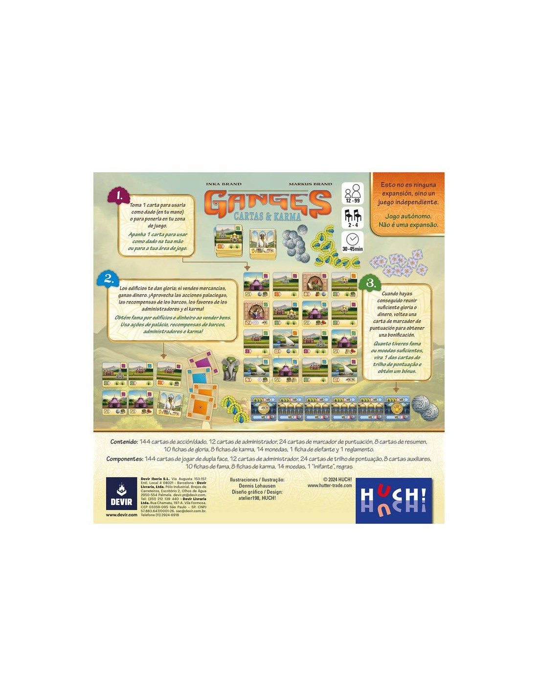 Diseñado por Inka y Marcus Brand (creadores de la célebre saga de juegos Exit), esta edición es completamente independiente del Ganges original de colocación de dados. Permite partidas para grupos de 2 a 4 jugadores, a partir de 12 años, de unos 45 minutos de duración. El objetivo de Ganges Cartas y Karma consiste en sumar gloria y riqueza para tu provincia. Cuando un jugador obtiene 3 fichas de gloria o 6 rupias, voltea una carta de su marcador de puntuación y recibe una bonificación. El primer jugador que voltee las 6 cartas de su marcador gana la partida. El motor principal de esta edición de Ganges son las cartas que, por un lado, muestran una acción y por el otro un color y un valor de dado específico. A lo largo de la partida, estos valores servirán para pagar el coste de adquirir nuevas cartas. En cada turno, los jugadores podrán comprar cartas de distintos tipos (edificios, barcos, mercancías…) para obtener recursos clave: monedas, karma y gloria.