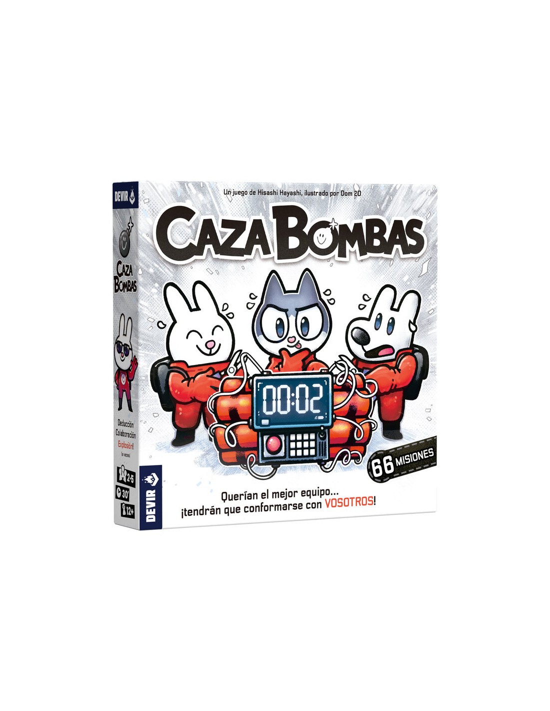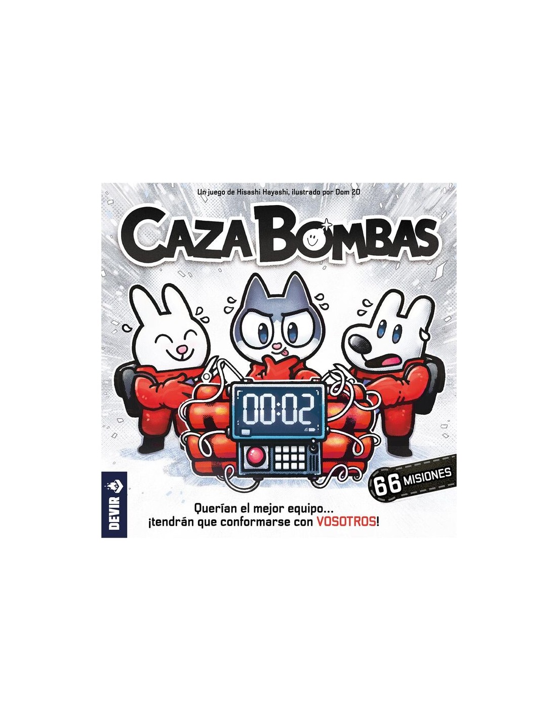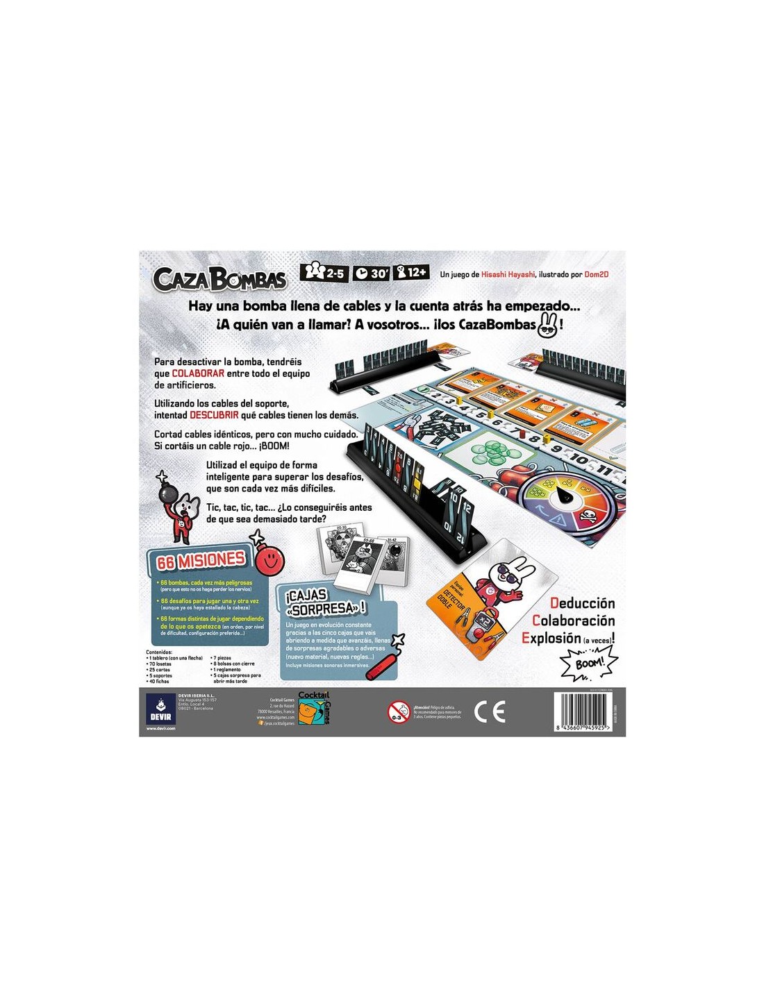 Diseñado por Hisashi Hayashi, Caza Bombas se puede disfrutar en pareja o en grupos de hasta 5 personas, a partir de 12 años, en misiones de unos 30 minutos. Caza Bombas es un juego cooperativo en el que cada jugador lleva a un artificiero. Todos los jugadores deberán trabajar en equipo con el objetivo de desactivar juntos la bomba de la misión asignada. ¡Pero cuidado! Si cortáis un cable rojo o si el detonador llega al final, ¡la bomba explotará!