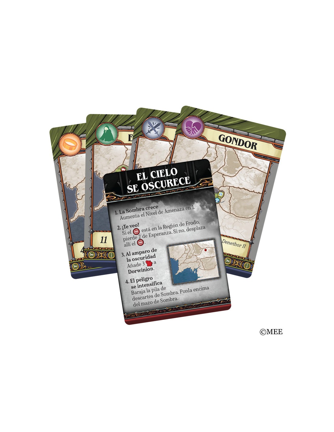 1 tablero, 48 cartas de Región, 14 cartas de Evento, 12 cartas de El cielo se oscurece, 24 cartas de Objetivo, 10 cartas de Referencia, 13 cartas de Personaje, 50 cartas de Sombra, 9 miniaturas de Nazgûl, 13 fifiguras de Personaje, 3 dados de Batalla, 7 dados de Búsqueda, 48 Tropas de la Sombra, 35 Tropas Aliadas, 6 fifichas de Refugio, 6 fifichas de Fortaleza, 1 fificha de Ojo de Sauron, 1 marcador de Nivel de Amenaza, 1 fificha de Solitario, 1 marcador de Esperanza, 36 fifichas de Símbolo, 1 torre de dado de Barad-dür.