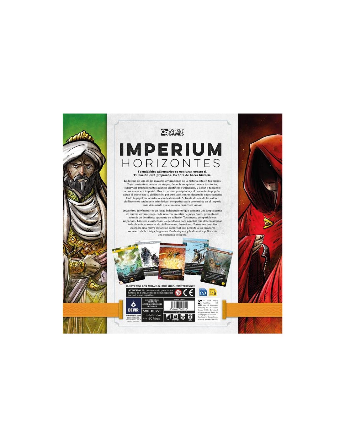 Diseñado por Nigel Buckle y Dávid Turczi, Imperium: Horizontes es un título que se puede disfrutar en solitario o en grupos de hasta 4 jugadores, a partir de 14 años, en sesiones de unas dos horas de duración. Esta edición es completamente autojugable e independiente de las ediciones anteriores (Clásicos y Legendarios). Horizontes incluye las civilizaciones abasí, aksumita, cultista, gupta, inuit, japonesa, magiar, marciana, maya, polinesia, sasánida, taína, tang y wagadou. Cada una de ellas constituye un oponente único y desafiante, tanto en partidas multijugador como en sesiones en solitario.