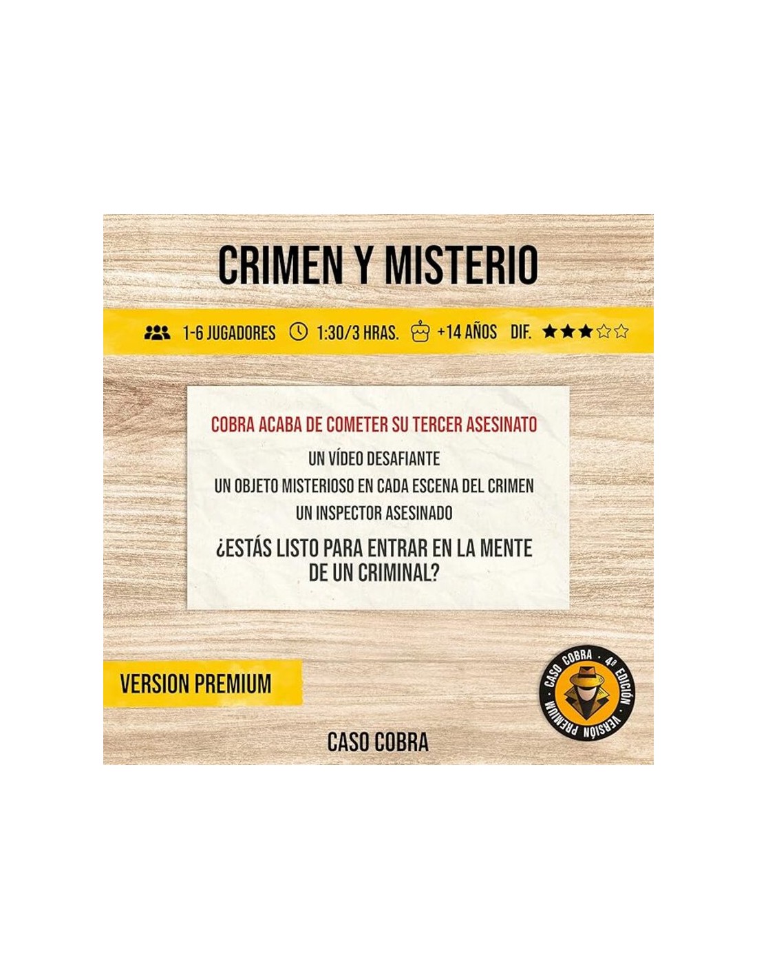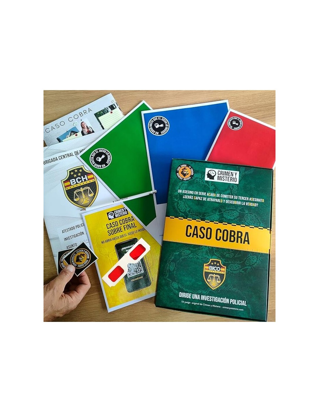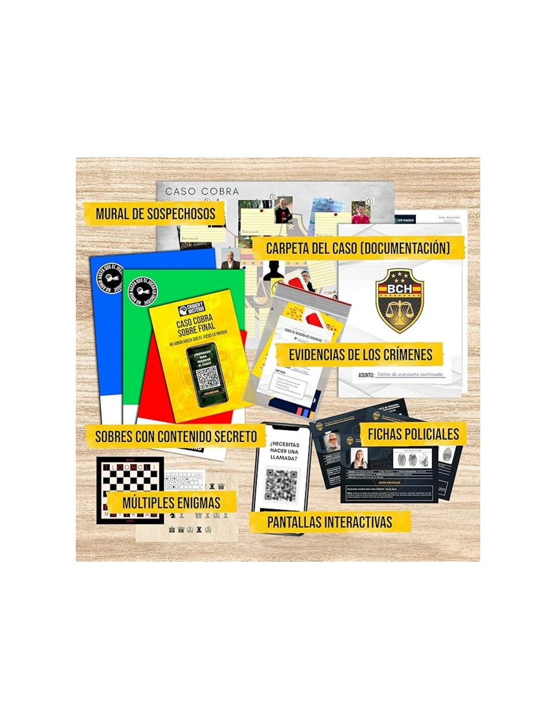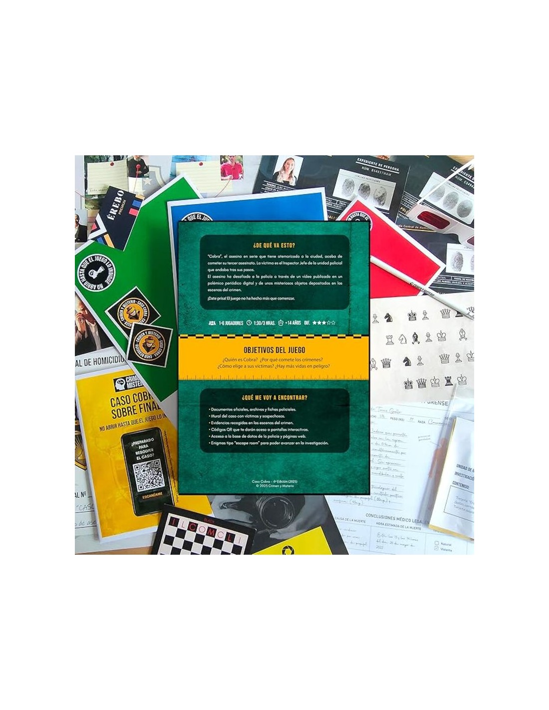 ¡Conviértete en el detective que Madrid necesita! Caso Cobra es un intenso juego de mesa de la colección Crimen y Misterio que fusiona la experiencia de un Escape Room en casa con la emoción de una investigación criminal.