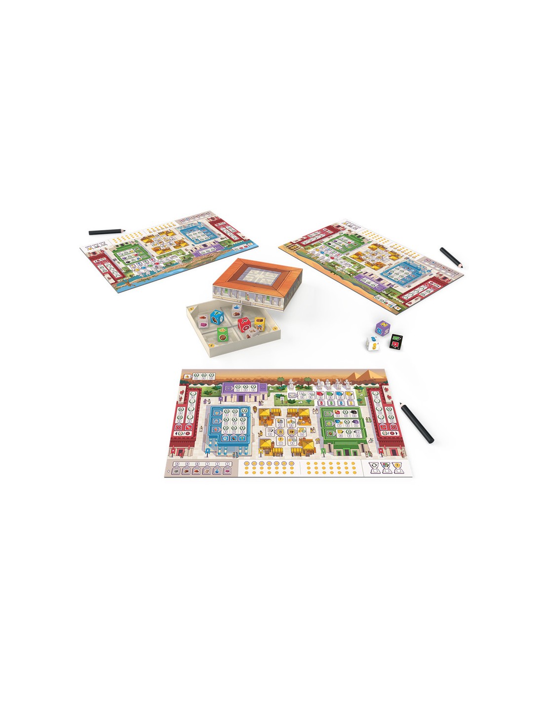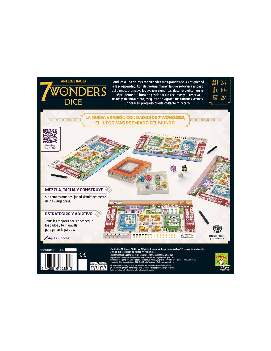 7 Wonders Dice es una emocionante reinterpretación del clásico juego de mesa 7 Wonders, ahora en formato shake & write. En esta edición, los jugadores lideran una de las siete ciudades más grandes de la Antigüedad, compitiendo por construir maravillas, avanzar científicamente, comerciar y gestionar recursos… todo ello mediante dados.