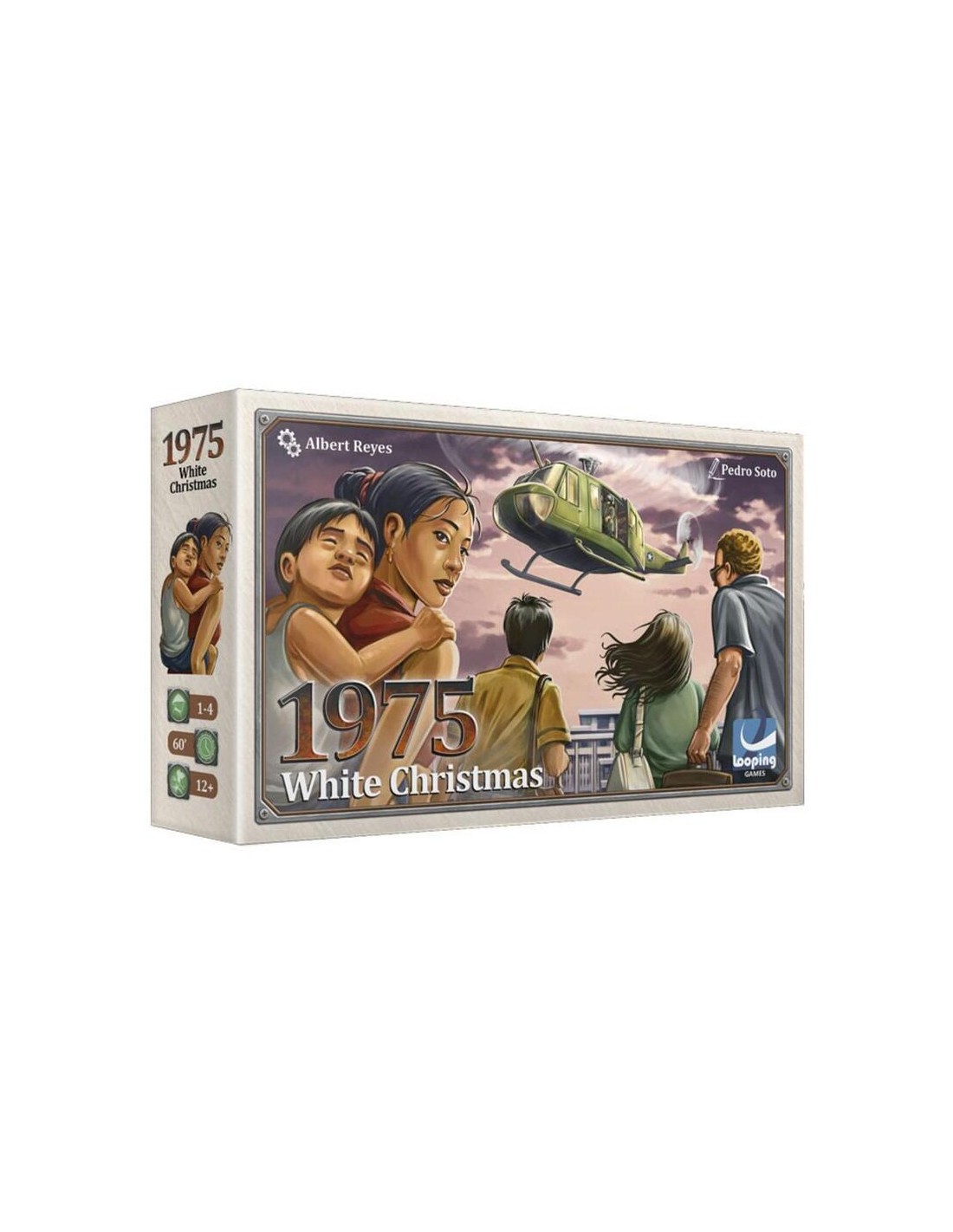 1975: White Christmas es un juego de mesa competitivo de Looping Games que te transporta al 29 de abril de 1975, durante las últimas horas de la Guerra de Vietnam. Ese día, la radio de Saigón emitió el mensaje codificado “La temperatura en Saigón es de 105 grados y subiendo”, seguido del villancico White Christmas, señal que activó la Operación Frequent Wind, la mayor evacuación en helicóptero jamás realizada.