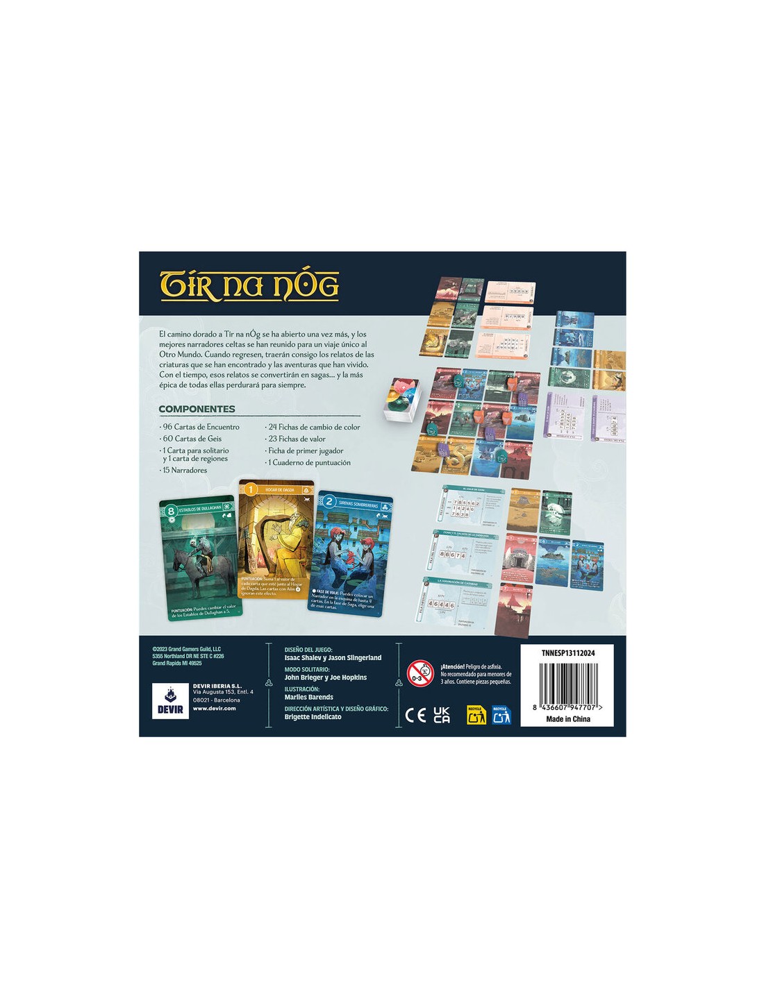 Diseñado por Isaac Shalev y Jason Slingerland, Tír na nÓg se puede disfrutar en solitario o en grupos de hasta 5 jugadores, a partir de 10 años, en sesiones de unos 45 minutos de duración. A través de mecánicas de gestión de mano y colocación de trabajadores, los jugadores competirán por sumar la mayor cantidad posible de puntos formando una saga única en su zona de juego con las cartas de relato.