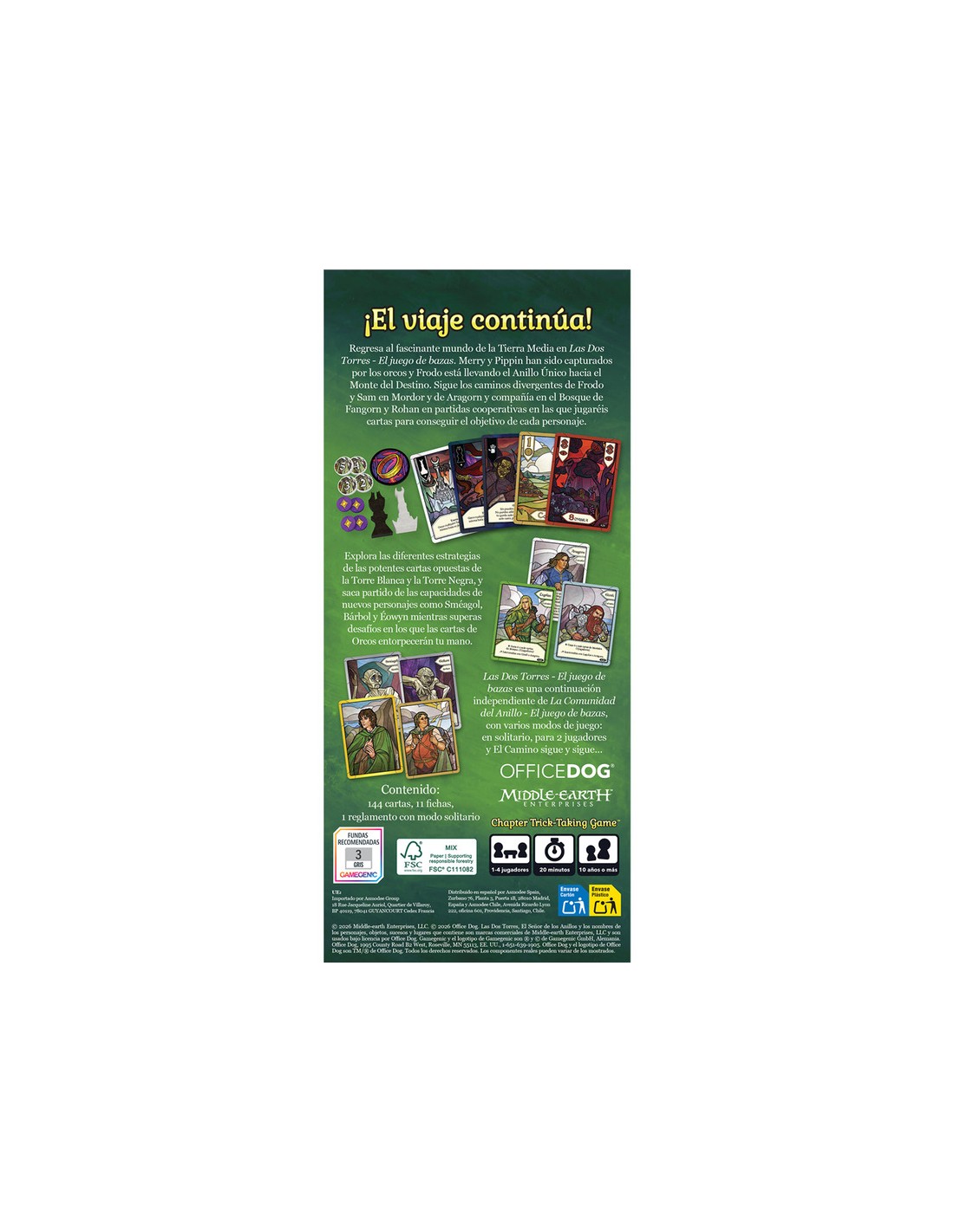 Regresa al fascinante mundo de la Tierra Media en Las Dos Torres - El juego de bazas. Merry y Pippin han sido capturados por los orcos y Frodo está llevando el Anillo Único hacia el Monte del Destino. Sigue los caminos divergentes de Frodo y Sam en Mordor y de Aragorn y compañía en el Bosque de Fangorn y Rohan en partidas cooperativas en las que jugaréis cartas para conseguir el objetivo de cada personaje.