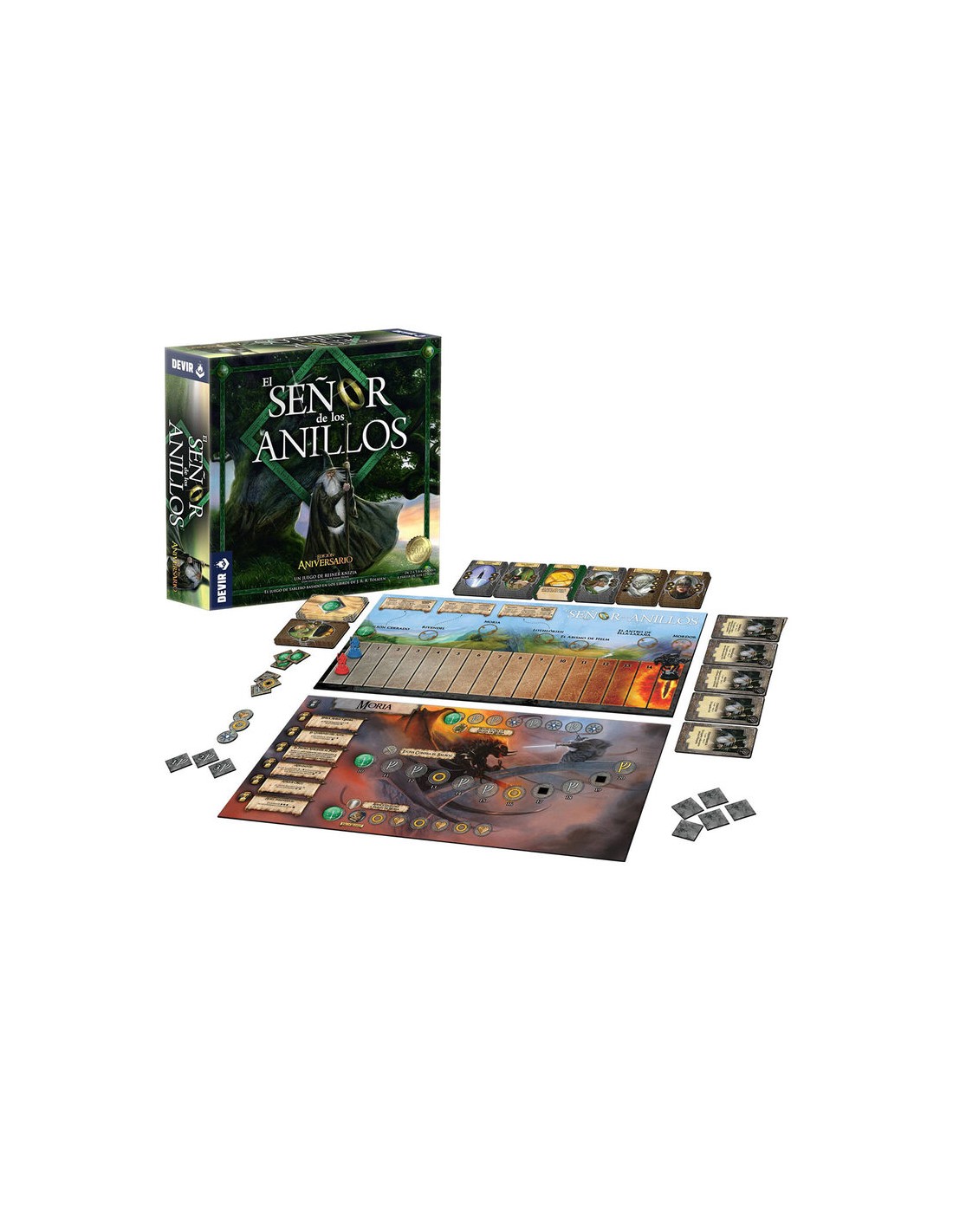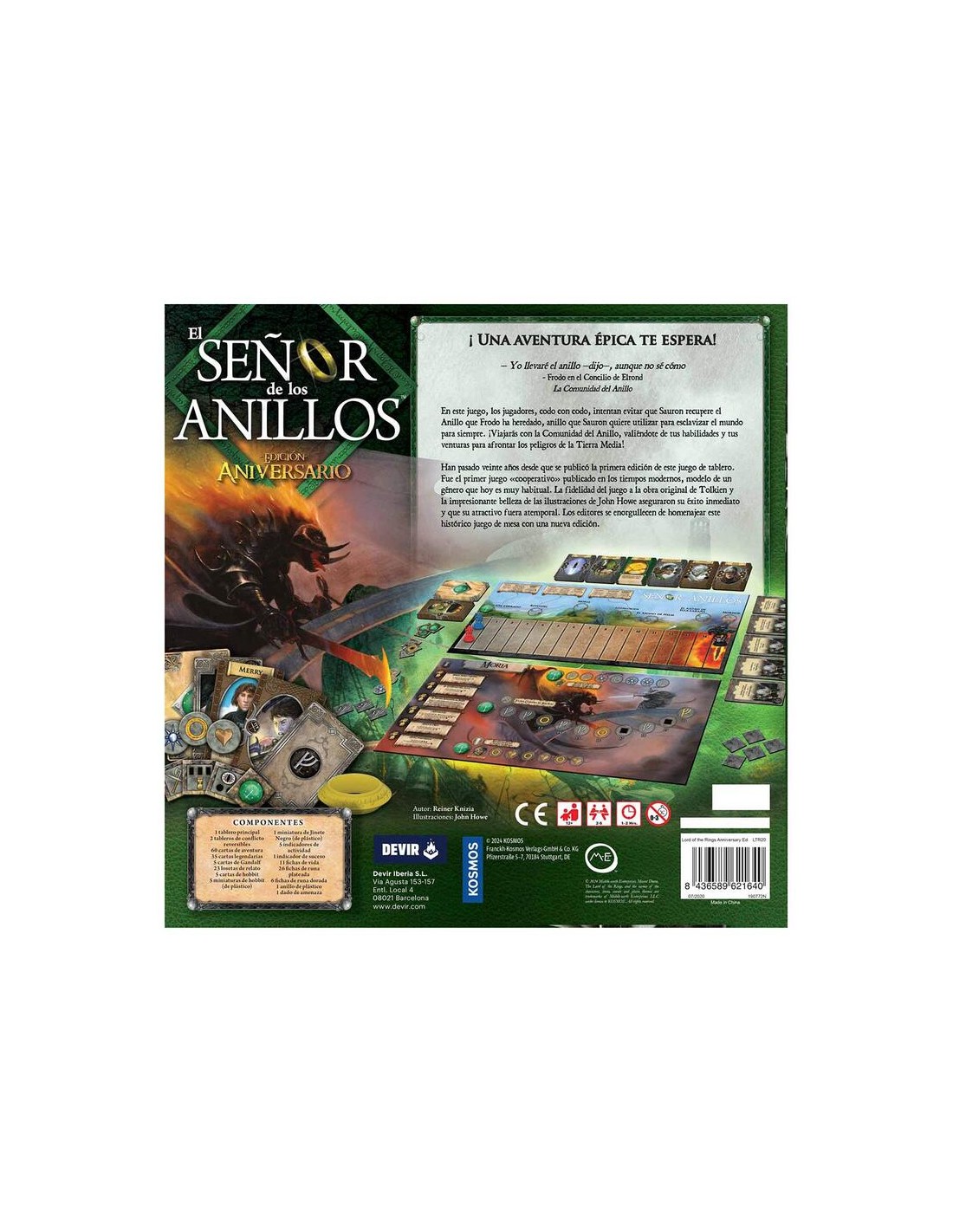 En El Señor de los Anillos, el juego de mesa, te conviertes en un miembro de la Comunidad del Anillo y controlas a uno de los hobbits, cada uno con una habilidad única. ¿El objetivo? Evitar caer en la corrupción de Sauron y llegar al monte del Destino para eliminar el Anillo Único. Para conseguirlo deberéis cooperar, abriéndoos paso a través de cuatro tableros de juego. Cada uno de estos tableros representa uno de los escenarios más emblemáticos de la trilogía de Tolkien: aventúrate a las profundidades de Moria, vive la épica batalla del abismo de Helm, escapa de las garras de la peligrosa Ella-Laraña en su madriguera y avanza por las peligrosas llanuras de Mordor rumbo al monte del Destino.