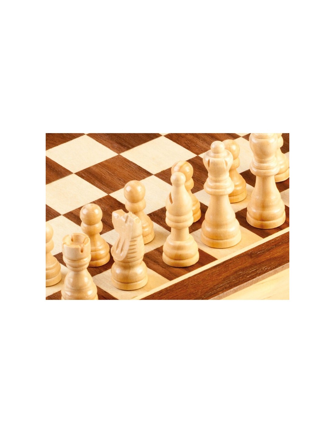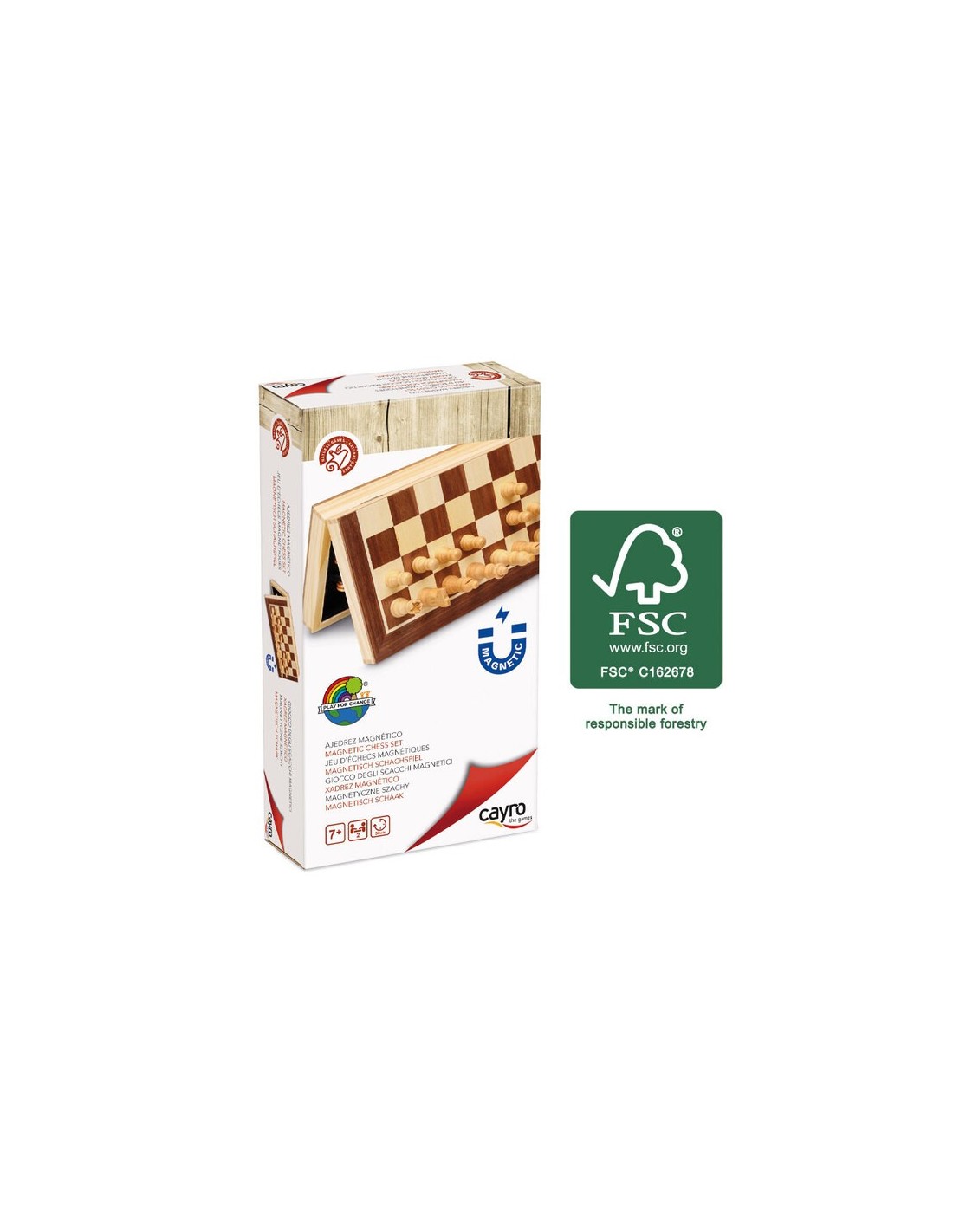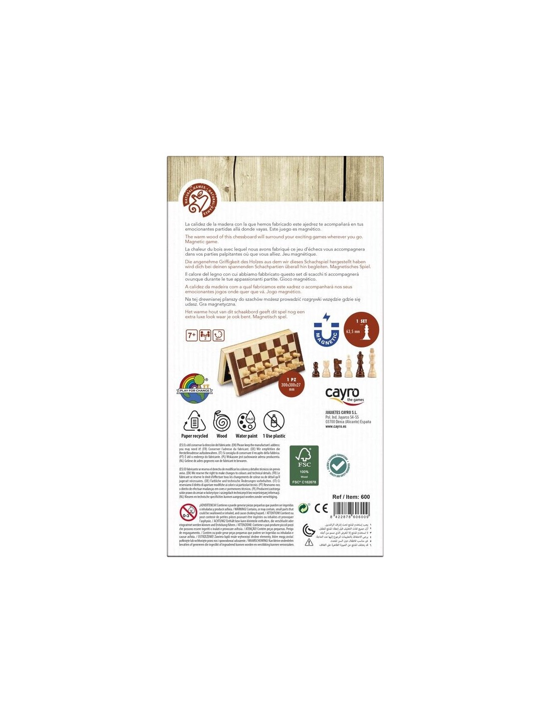 Juego de ajedrez de madera proveniente de bosques sostenibles. Fabricado por Cayro.