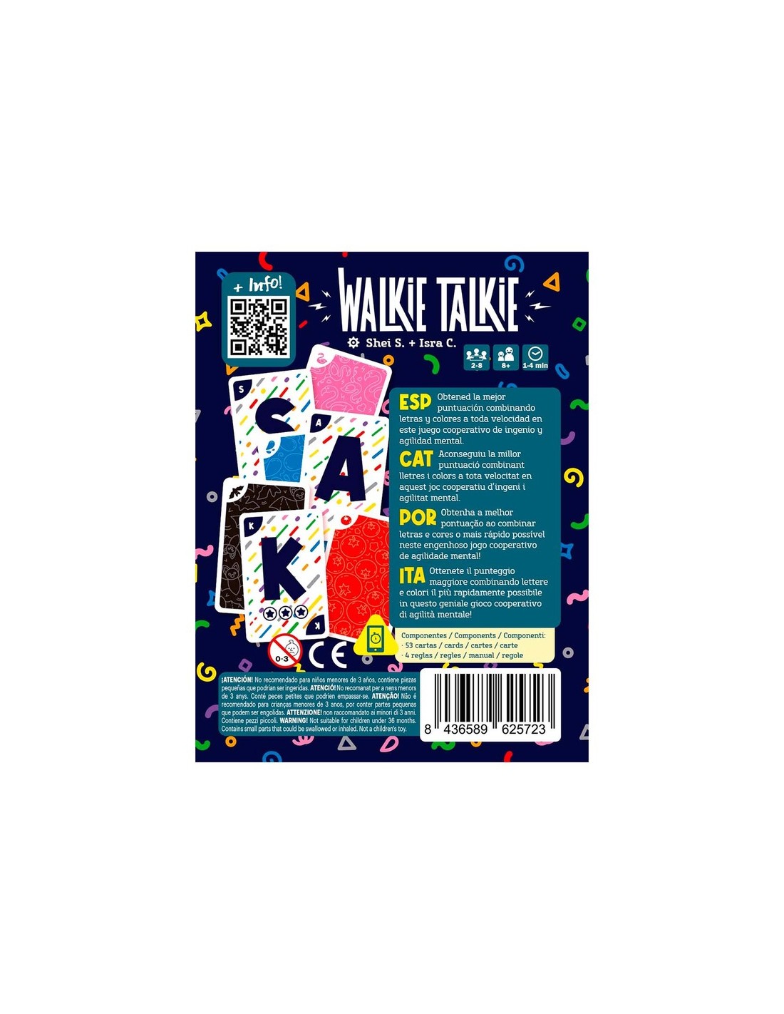 Walkie-Talkie es un juego cooperativo de cartas creado por Sheila Santos e Israel Cendero en el que pueden participar de 2 a 8 jugadores. Las partidas son muy rápidas, de entre 1 y 4 minutos dependiendo del número de jugadores. El objetivo es lograr la mayor puntuación posible descartando todas las cartas de la mano. En Walkie-Talkie, transmitir y recibir la información con rapidez y eficiencia es clave ¡para sumar la mayor puntuación!