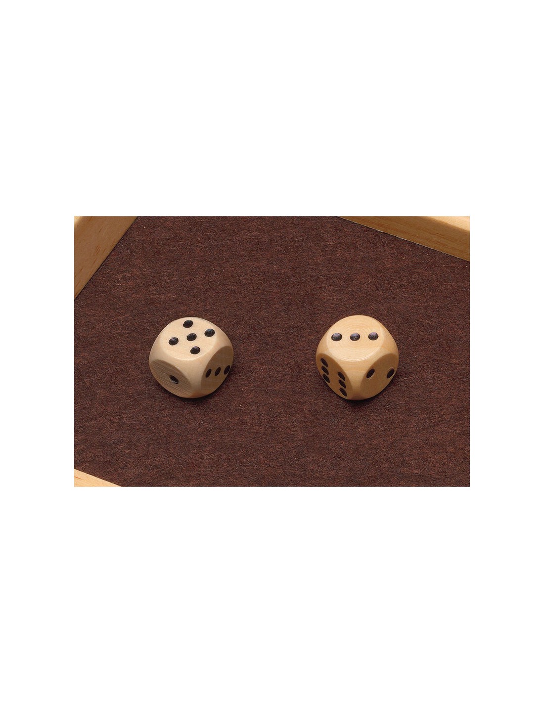 El juego incluye 1 tablero (275 x 35 x 190 mm) con base de fieltro y 2 dados de madera (16 x 16 mm). La madera ha sido obtenida a través de bosques responsables.