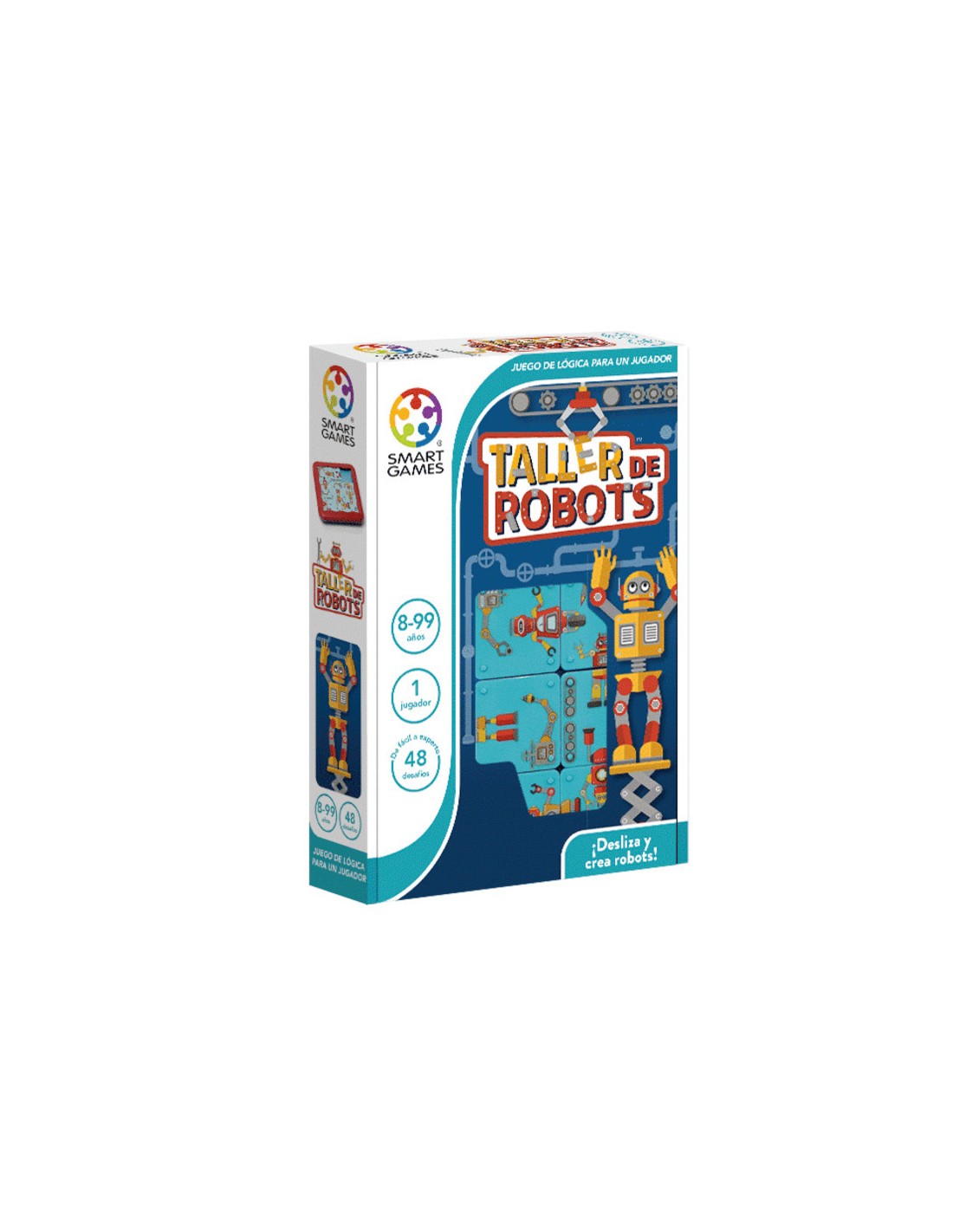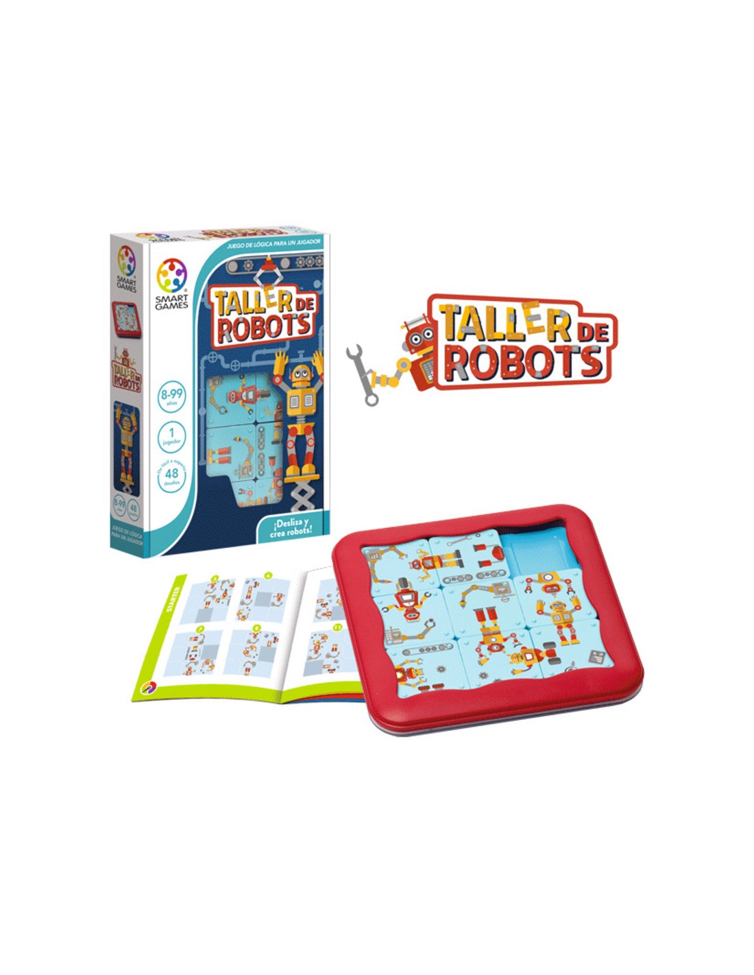 Taller de Robots es un desafiante juego de lógica con 48 retos. Se trata de un juego en el siguiendo el libro de retos y partiendo desde una posición inicial, tendremos que ir deslizando las piezas en el tablero hasta conseguir crear robots. Cada robot debe tener ruedas o patas en una pieza y un cuerpo con cabeza en una pieza adyacente.