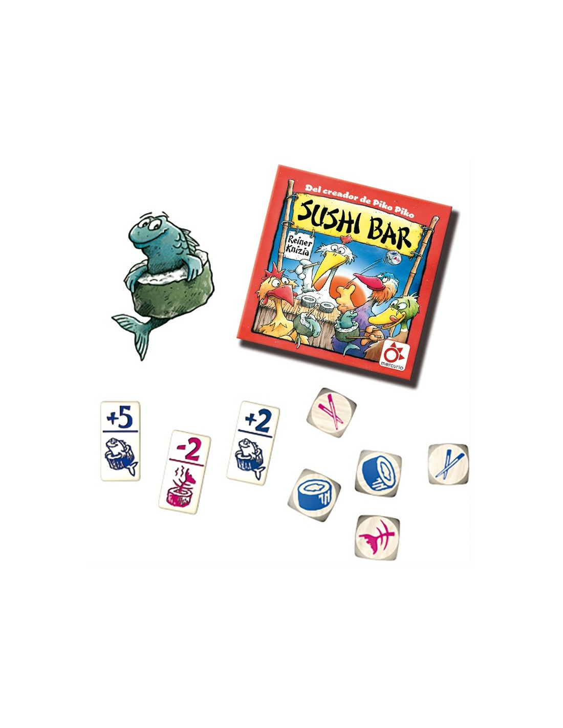 Sushi Bar es un juego de dados y fichas del creador de Piko Piko, Reiner Knizia. Un divertido juego de dados con mucha interección entre jugadores, en donde tratarás de conseguir fichas azules con los mayores puntos de sushi y fichas rojas con la menor puntuación posible de espina