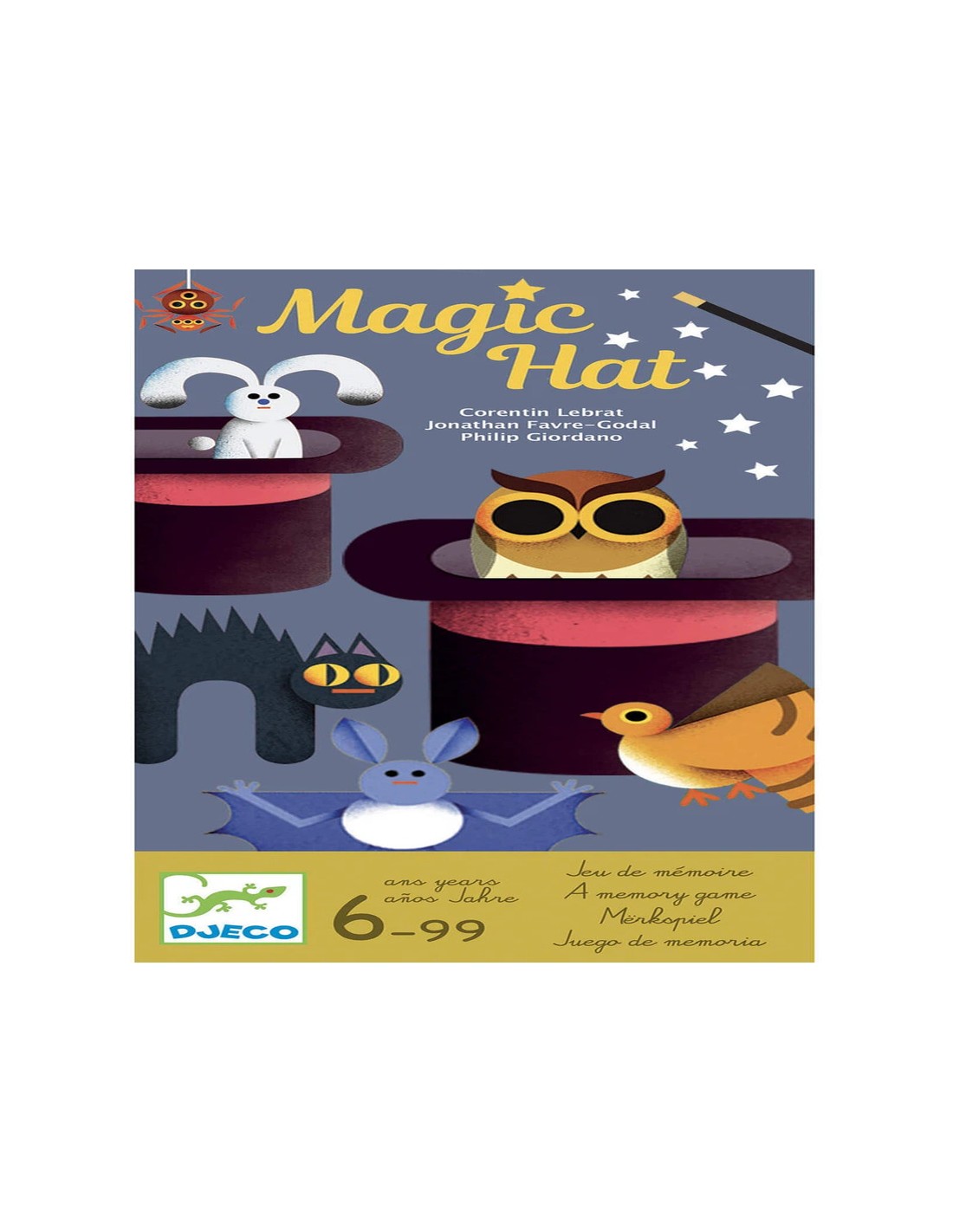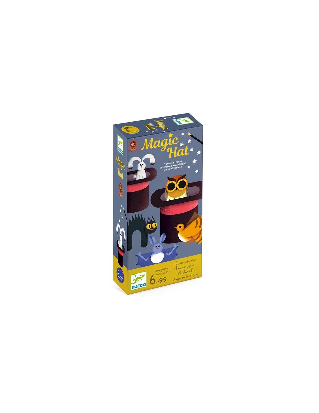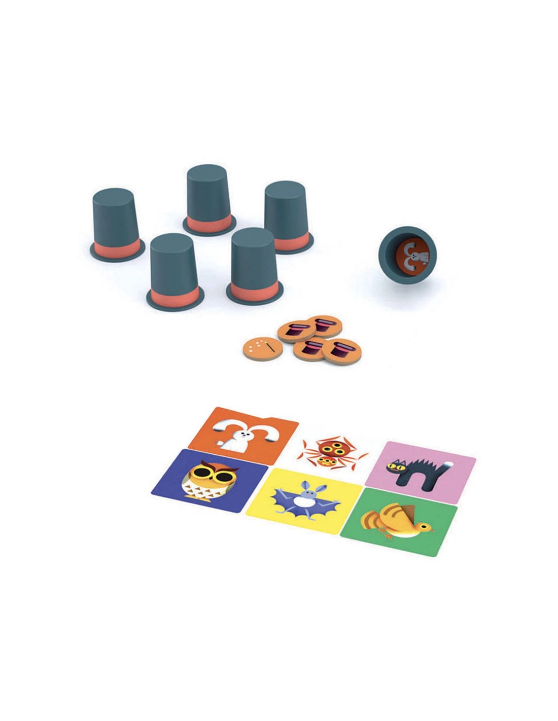 6 sombreros de mago de plástico, 6 tarjetas de animales, 4 fichas de sombrero de mago, 1 ficha de varita mágica. Reglas del juego en 10 idiomas.