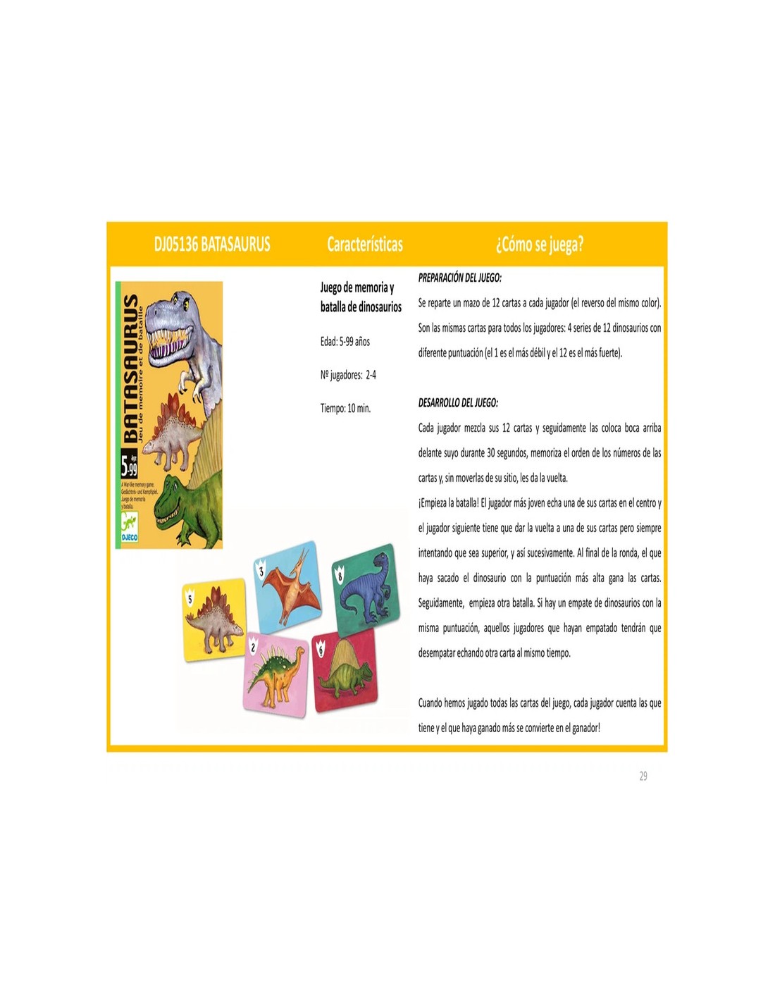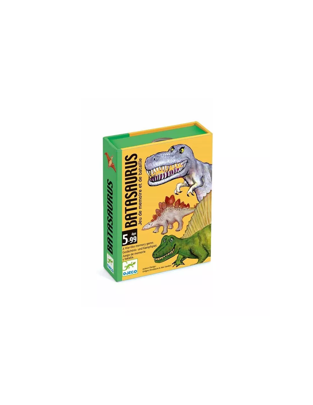 Batasaurus es un juego de cartas con dinosaurios, en el que necesitarás ¡mucha memoria!. Mezcla tus 12 cartas y colócalas boca arriba encima de la mesa. Tras unos segundos para memorizarlas, dales la vuelta y ponlas boca abajo y ¡empieza la batall!. En cada turno cada jugador elegirá una carta y a la de 1, 2, 3 le dan la vuelta y la más alta gana la baza. Al final de las doce bazas, el jugador que tenga más cartas, gana. Para ganar este juego será fundamental tener buena memoria y recordar dónde están los dinosaurios más fuertes.