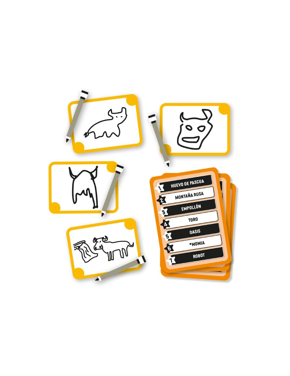 7 tableros de dibujo, 7 rotuladores delebles, 70 cartas (490 palabras), 1 cilindro grande, 1 dado especial, 24 fichas de puntuación, 1 reglamento.