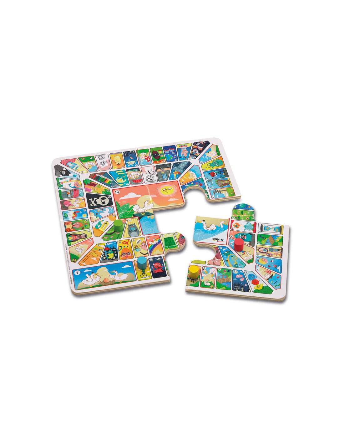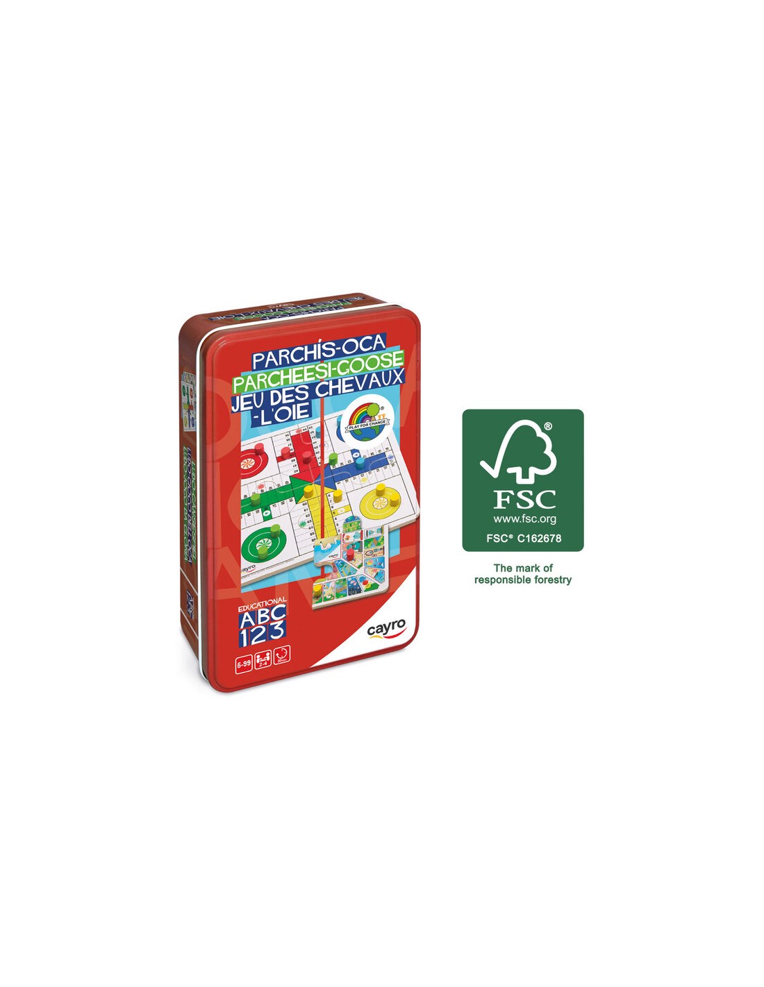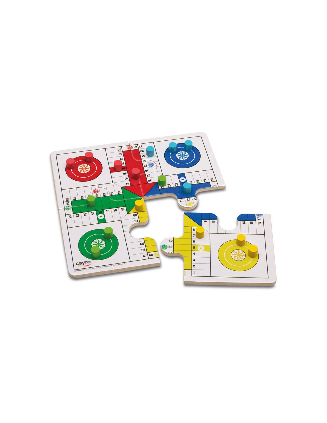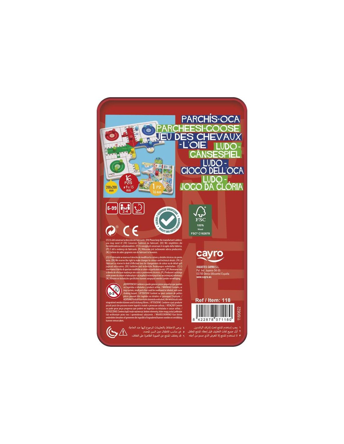 Parchis oca de viaje en caja de metal de Cayro son dos juegos de mesa en uno con un tamaño reducido en una caja metálica que se puede llevar a cualquier parte. Como si fuera un puzzle de cuatro piezas, monta el parchis o la oca y a jugar. El tablero, las fichas y los dados son de madera, y la caja es metálica.