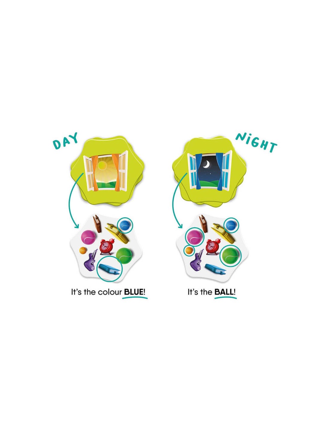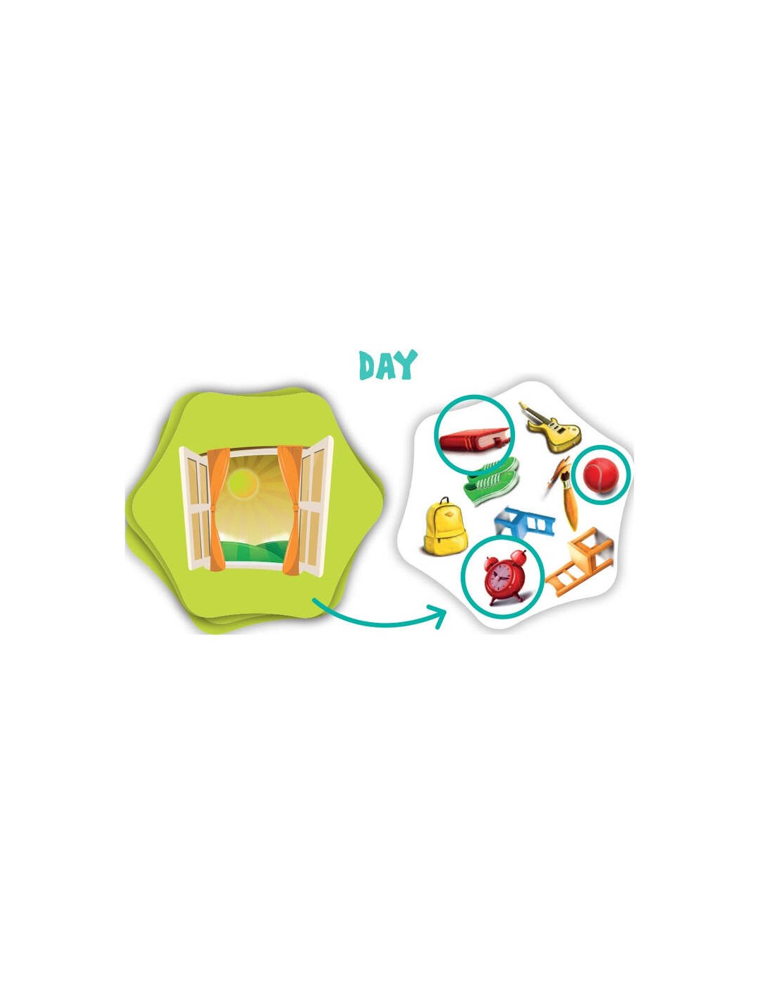 Uno de los jugadores da la vuelta a la primera carta de la pila y en función de si la carta que quedaen la pila indica noche o día, los jugadores/as deberán ser los primeros en localizar el color o el objeto correcto en la carta girada para ganar dicha carta. Algunos objetos especiales como la lampara, las cortinas o el globo terraqueo, pueden cambiar la condición de dia o noche.