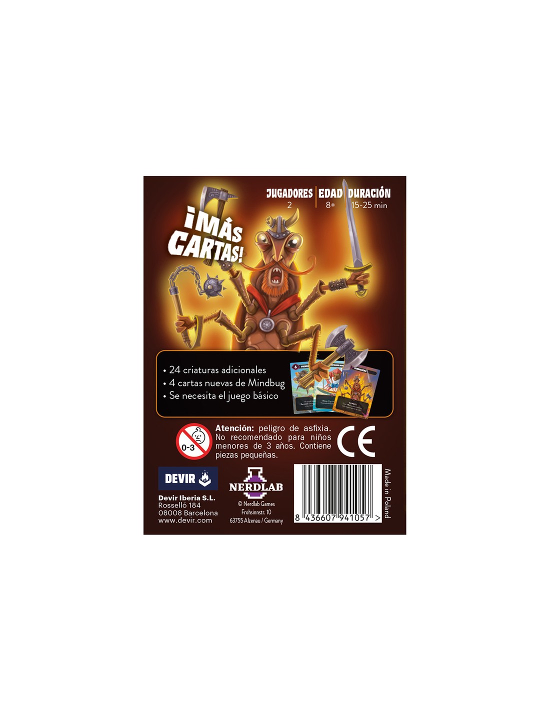 Mindbug combina la accesibilidad y el equilibrio de todo juego de naipes con la profundidad de un juego estratégico de cartas. El resultado es un duelo de habilidad con un punto bizarro que no se parece a ningún otro juego de cartas que hayas probado. Con esta expansión añadirás rejugabilidad a tus partidas, creando combinaciones de cartas nunca vistas hasta ahora.