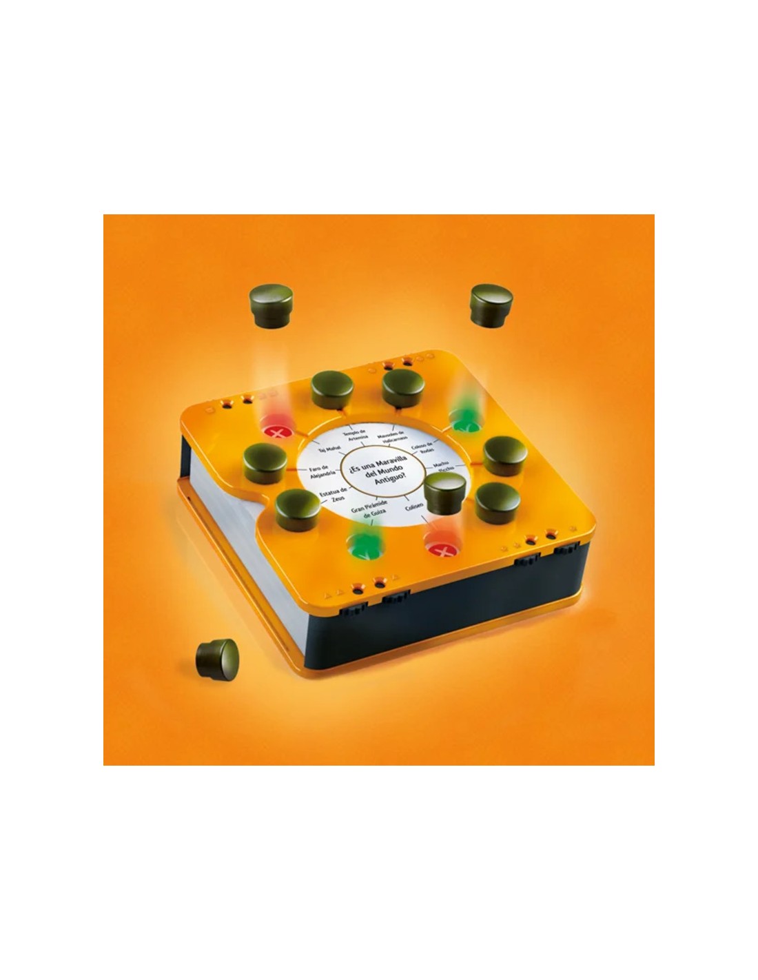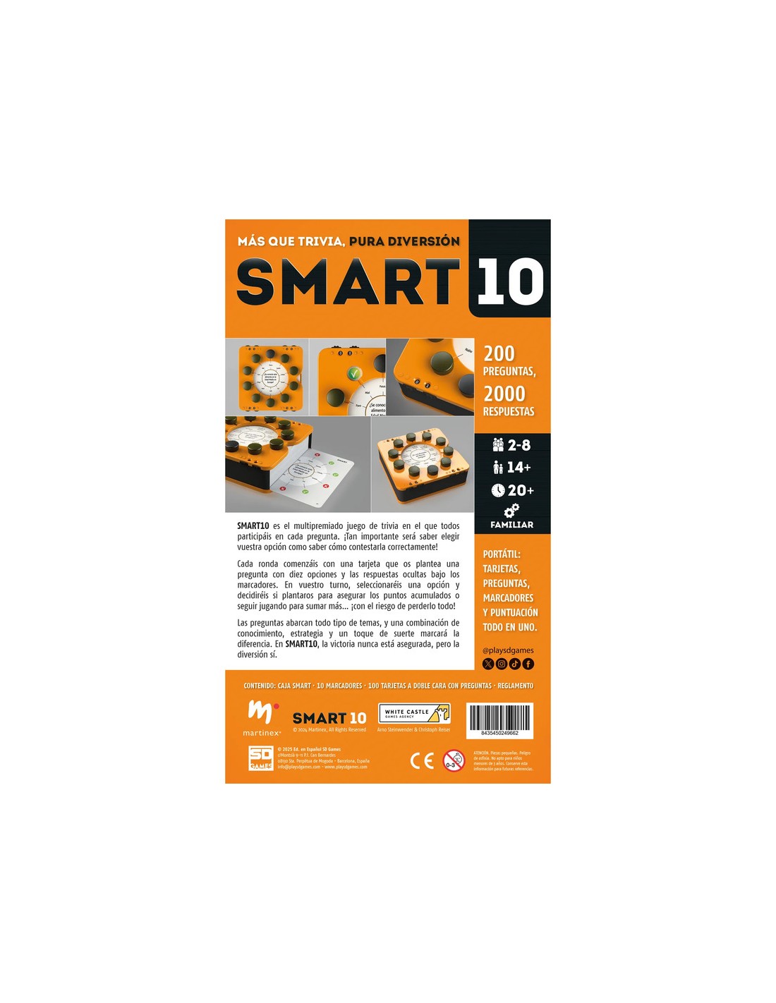 Todo el juego está incluido en la compacta caja Smart: las 200 preguntas y sus respectivas respuestas, los conta-dores de puntuación y los marcadores.