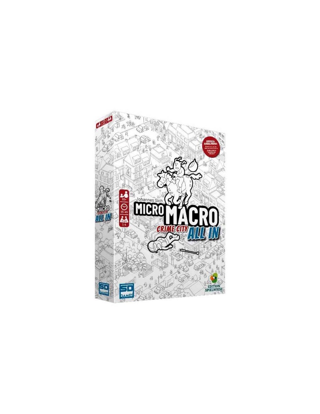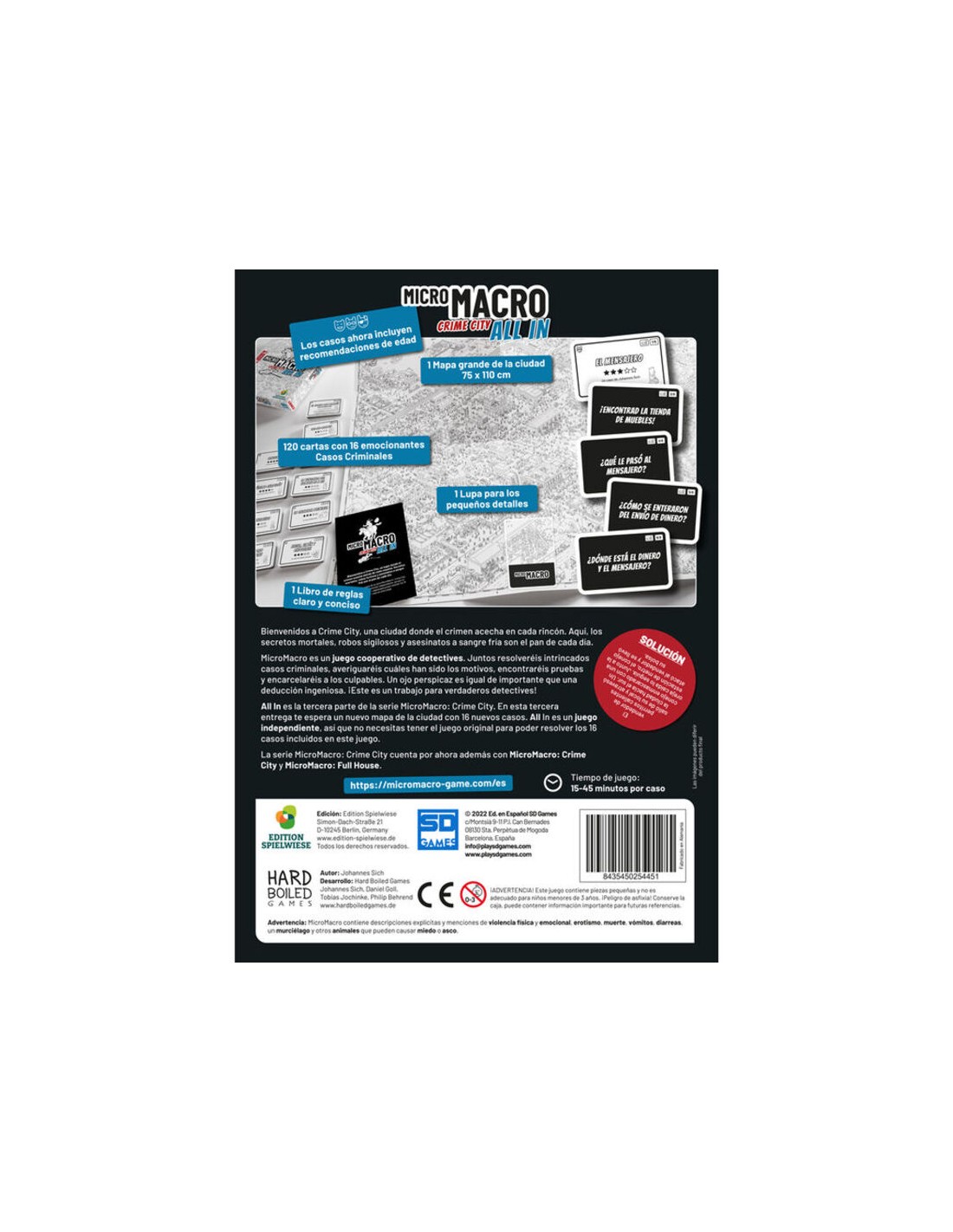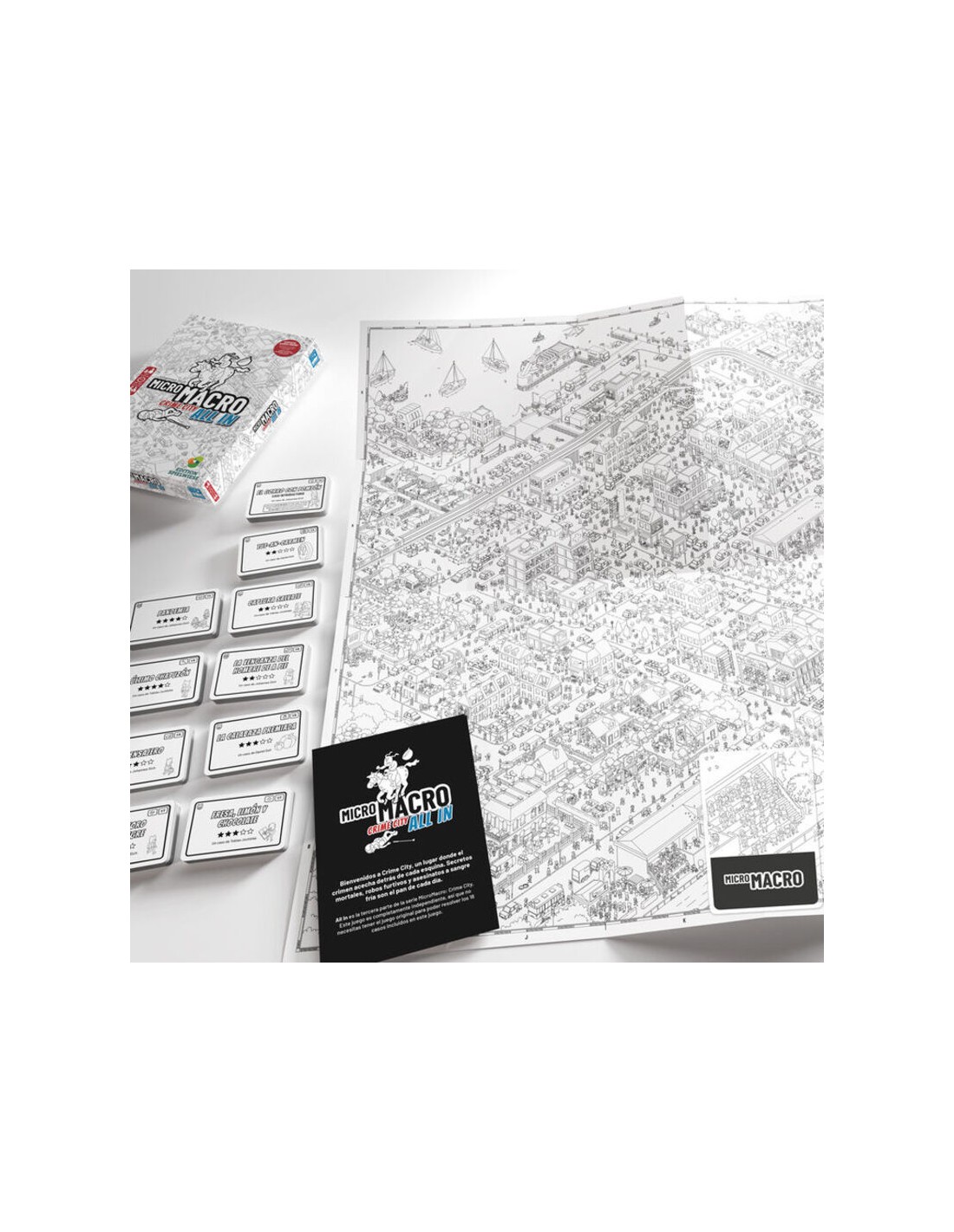 MicroMacro All IN es un juego de detectives cooperativo. Un nuevo y desafiante mapa de una ciudad nos espera para resolver los 16 intrincados casos de asesinato. La deucción, agudeza visual y concentracion serán fundamentales para averiguar cuáles han sido los motivos, encontrar pruebas y encarcelar a los culpables. ¡Este es un trabajo para verdaderos detectives!