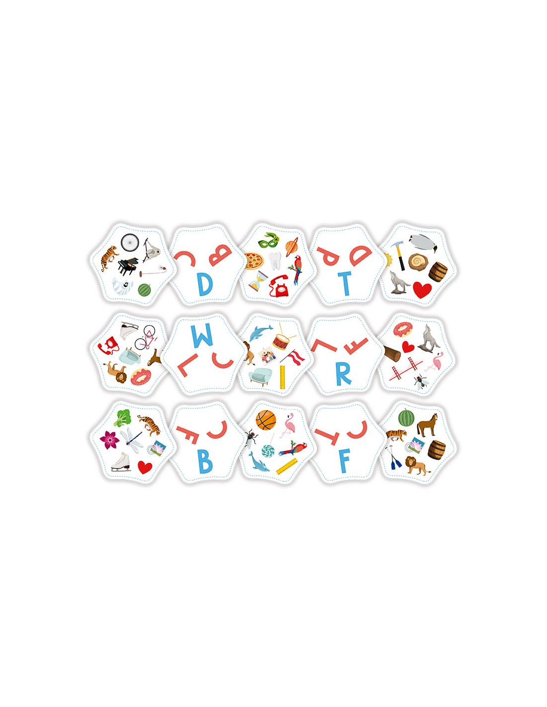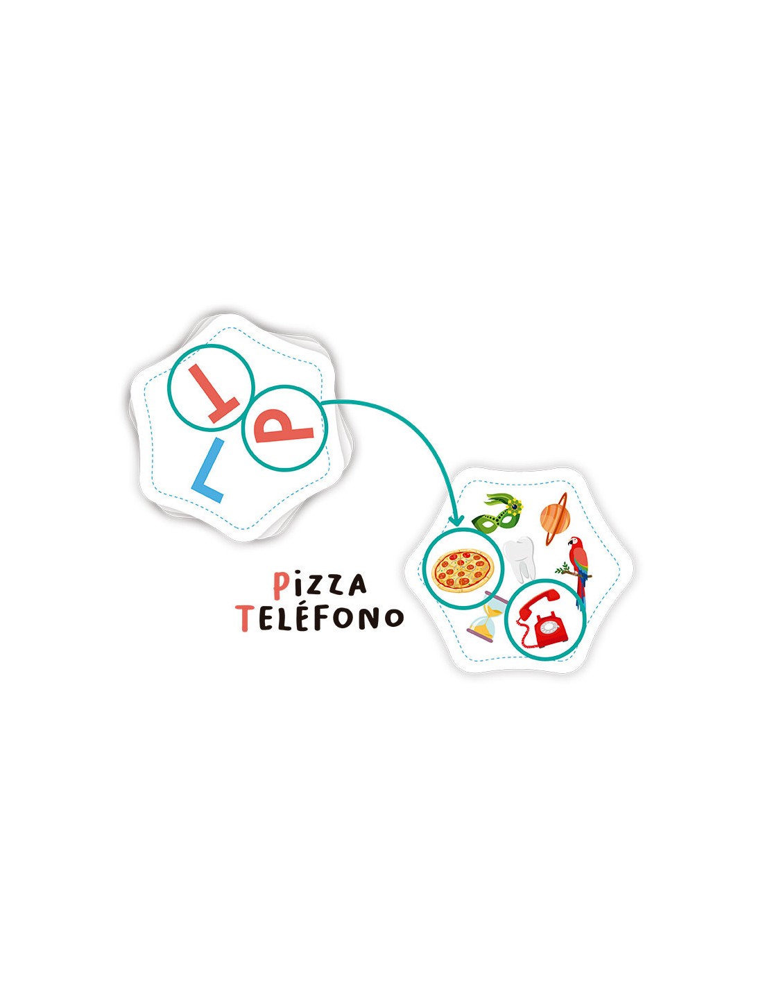 Se forma una pila en el centro de la mesa, con todas las cartas con las letras hacia arriba. El primero/a en encontrar un enlace, es decir, en asociar una letra con un objeto, colocar la mano encima de la carta y decir la palabra correctamente, se lleva la carta.