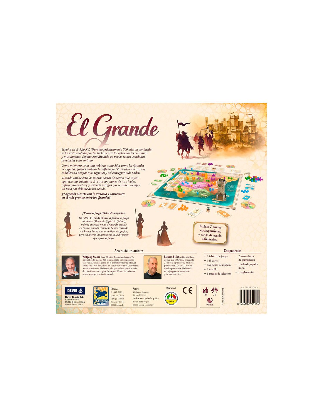 El Grande es un juego familiar imprescindible en cualquier ludoteca. Sentó las bases de la mecánica de mayorías en los juegos de mesa modernos, en la que los jugadores deben competir por tener más presencia en ciertos territorios y así ganar más puntos. Funciona tanto como juego de iniciación, para aquellos participantes menos familiarizados con la afición o que buscan nuevos retos, y al mismo tiempo exige cierto nivel de estrategia para tratar de alcanzar la máxima puntuación. Una ocasión única para redescubrir un clásico que marcó una época, con un diseño actualizado, revisado y bello.
