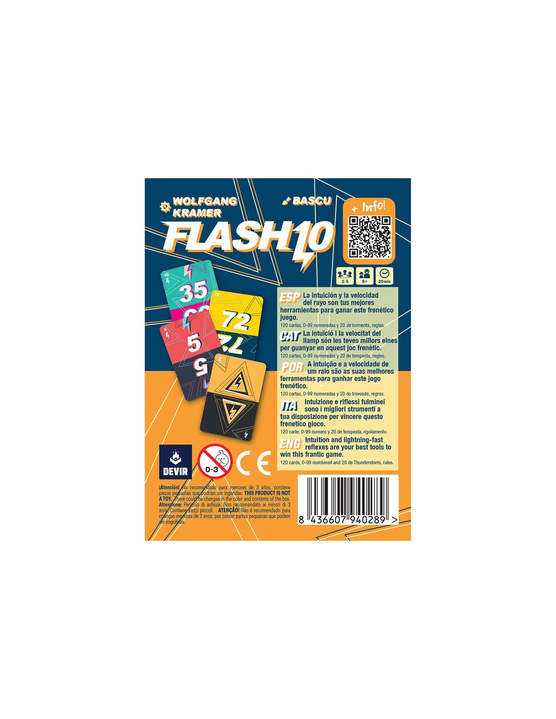 Flash 10 es un frenético juego de cartas de la colección Devir Pocket. De 2 a 5 jugadores y a partir de 8 años, en este juego de rápidez los jugadores compiten robando cartas todos a la vez por ser el primero en hacer una fila de 10 cartas en orden ascendente. Las cartas de tormenta te servirán de comodín pero te restarán un punto al final de la partida y las cartas con que tengan un símbolo de rayo, te drán un punto más.