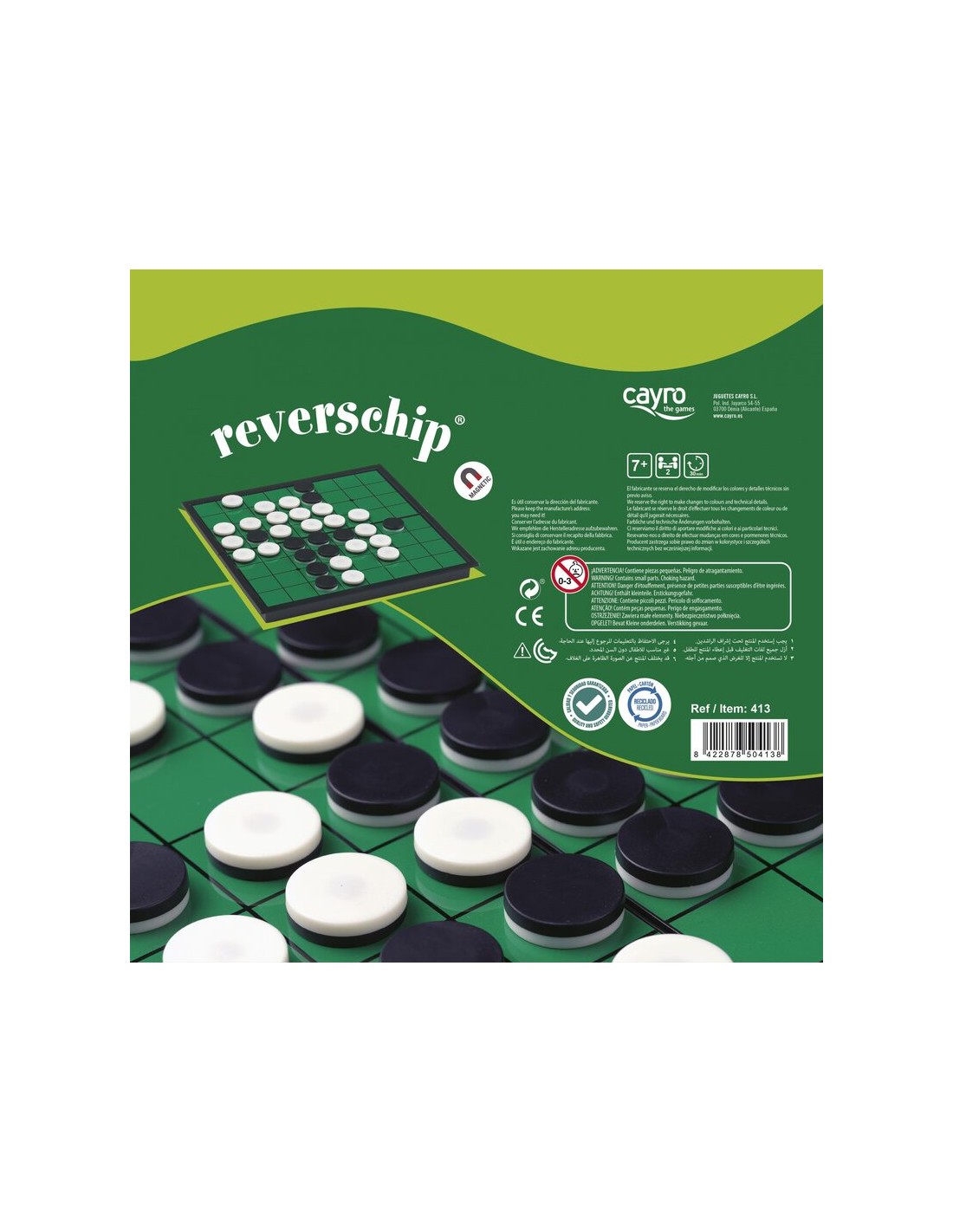Reverschip magnético de Cayro es una versión reducida y magnética del clásico juego Othello, un juego para dos jugadores en el que los jugadores tratan de atrapar las fichas del oponente entre las suyas para cambiarlas de color. Un juego muy fácil de aprender pero muy difícil de dominar.