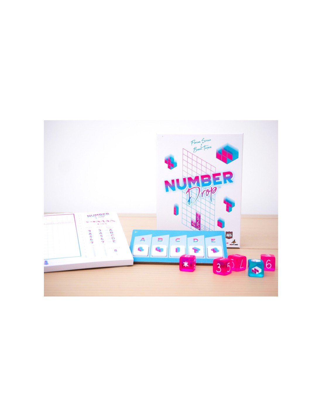 Number Drop es un genial juego familiar de "tipo roll & write de 1 a 6 jugadores. En este juego, con la tirada de dados tendremos que conseguir tener números iguales o números consecutivos juntos con el fin de obtener puntos y bloquear casillas del resto de jugadores.