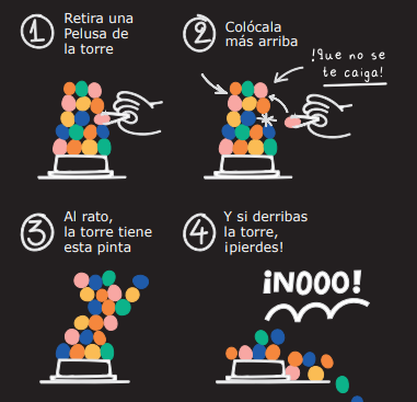 Retira una Pelusa y colócala *en cualquier lugar* que esté más arriba de la torre, sin que se te caiga... y sin tirar otras Pelusas. ¡Y sobre todo no derribes la torre! Si derribas la torre, pierdes.