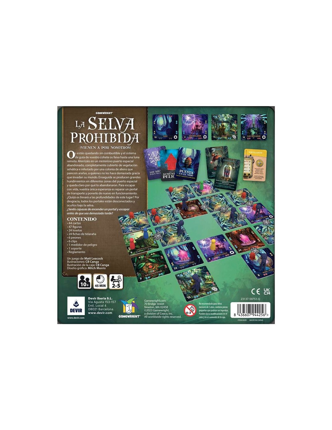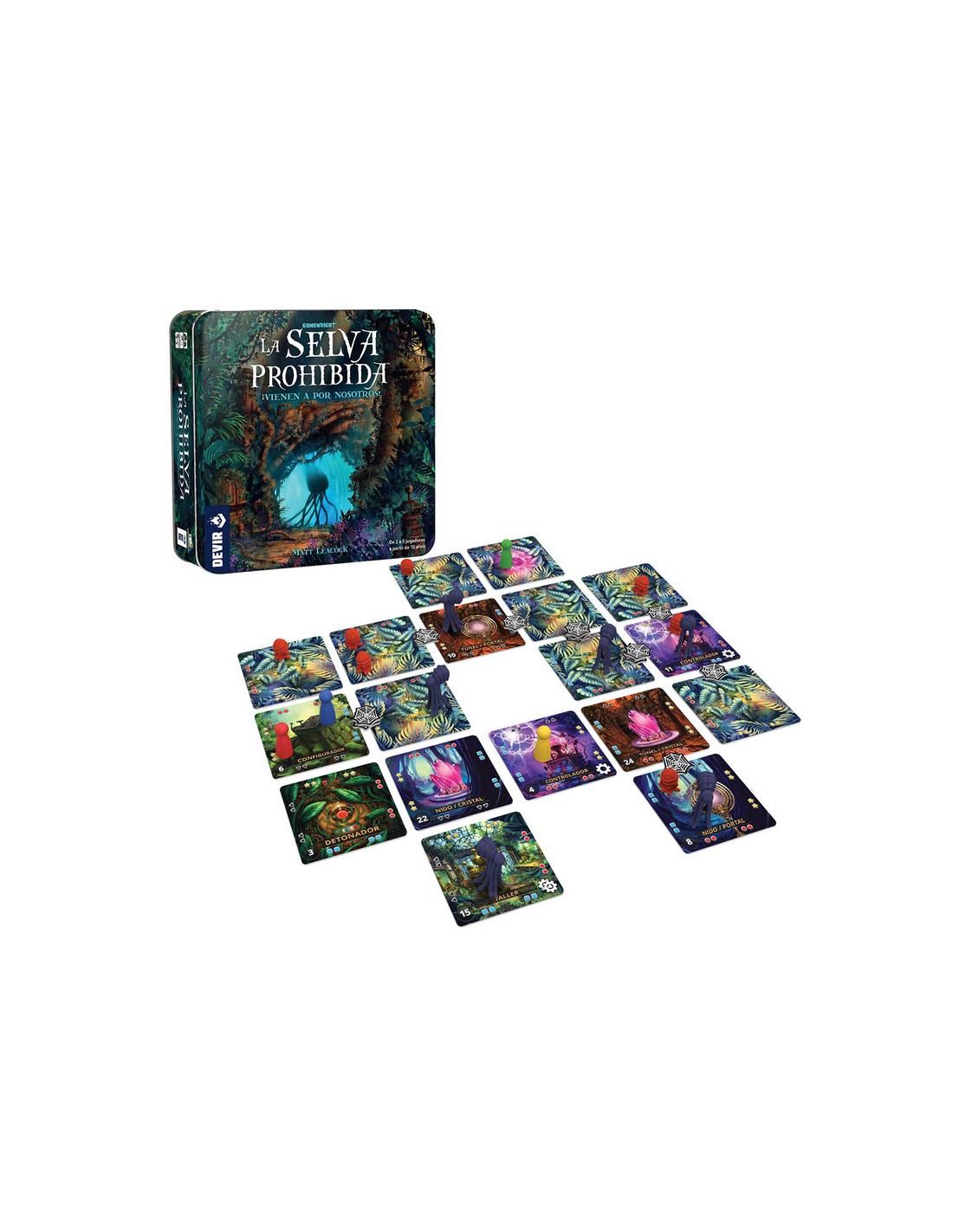 Diseñado por Matt Leacock (el célebre autor de la saga Pandemic), La selva prohibida permite partidas para parejas y grupos de hasta 5 jugadores, a partir de 10 años, de unos 45 minutos de duración. En este juego cooperativo, los jugadores deben trabajar en equipo para activar un portal y escapar antes que se derrumbe el terreno o que les atrapen los aliens.