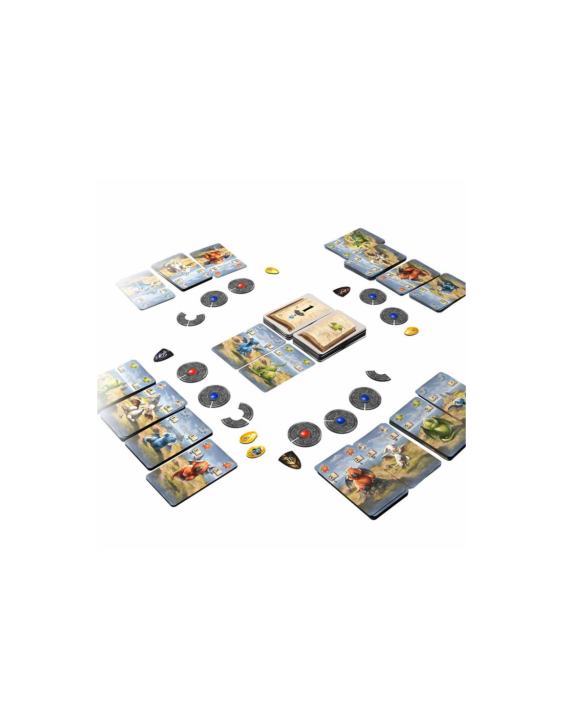 En su turno, cada jugador puede recoger hasta 3 cartas de dragón, que servirán para cumplir con las condiciones que pide el libro mágico para recibir recompensas. Pero eso no es todo… Los jugadores también pueden usar una de sus cartas para cambiar las páginas del libro, de modo que hay varias oportunidades para conseguir una recompensa. La partida sigue hasta que los participantes acumulan una cierta cantidad de amuletos (que varía en función del número de jugadores).