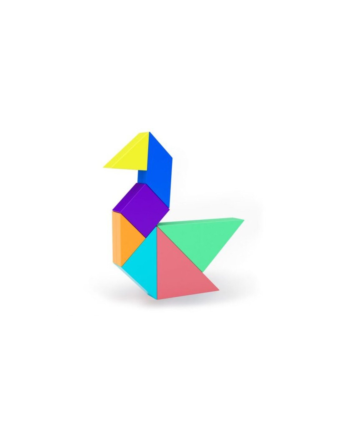 Se trata de un juego compuesto por 7 piezas geométricas magnéticas de diferentes formas (triángulos, cuadrado y paralelogramo) y una serie de tarjetas con retos. El objetivo es utilizar las 7 piezas para formar la silueta que se muestra en cada tarjeta, sin que ninguna pieza se superponga.