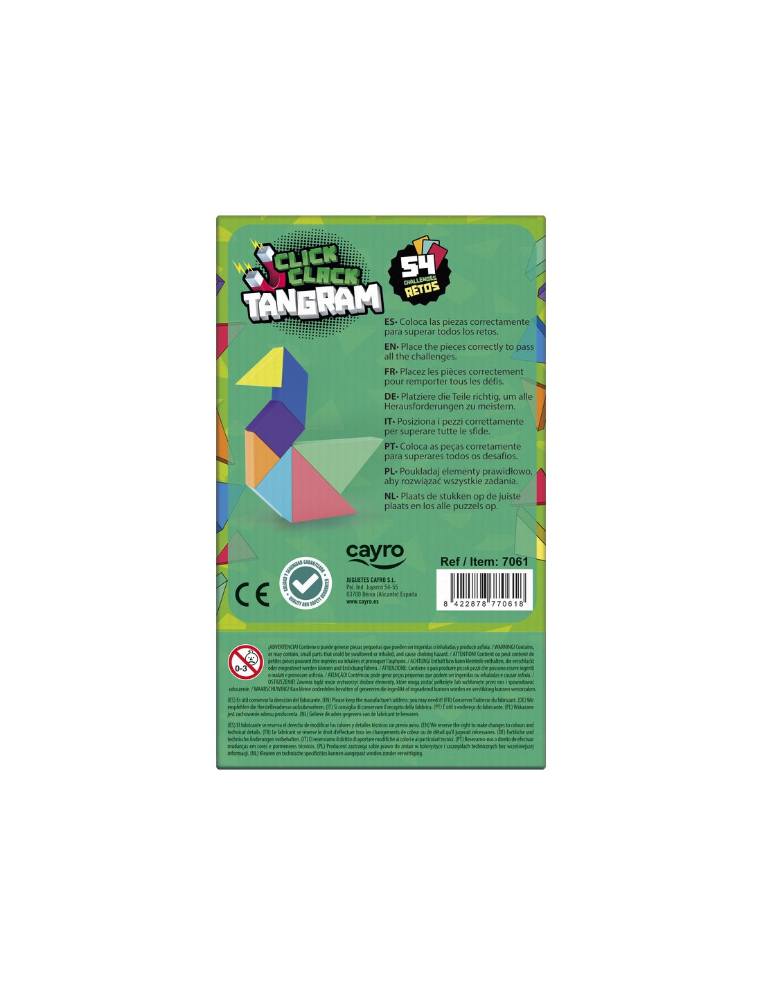 Click Clack Tangram de Cayro es un juego de mesa individual que rescata el tradicional y estimulante tangram, presentándolo de una forma moderna y práctica. Este juego es ideal para niños y adultos que buscan desarrollar su lógica, visión espacial y capacidad de resolución de problemas de una manera divertida y entretenida.