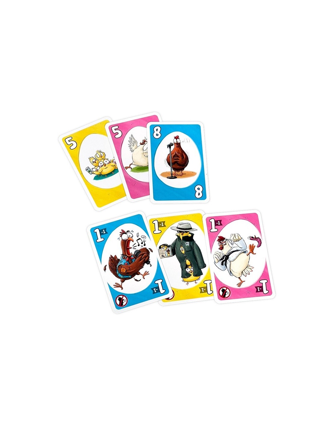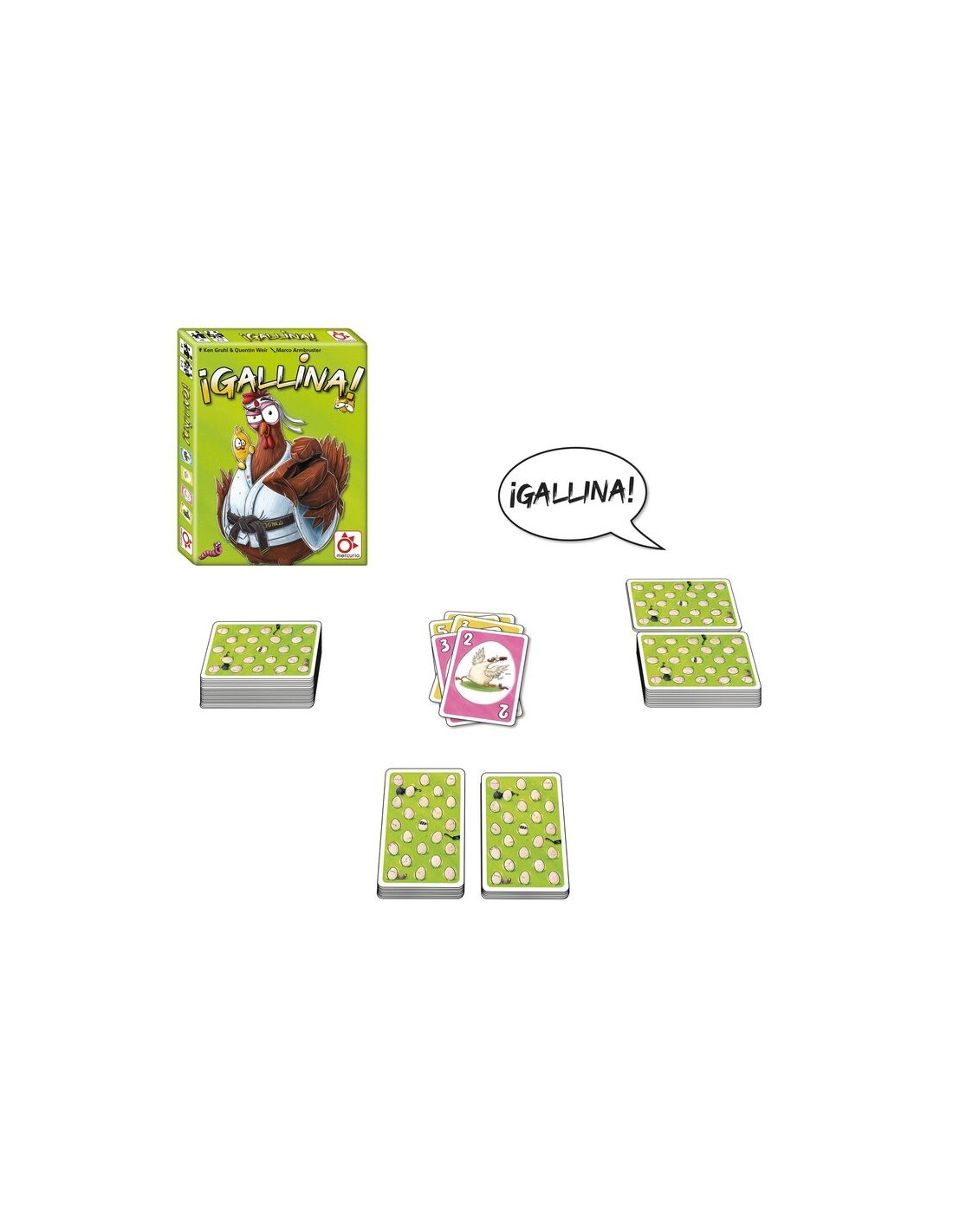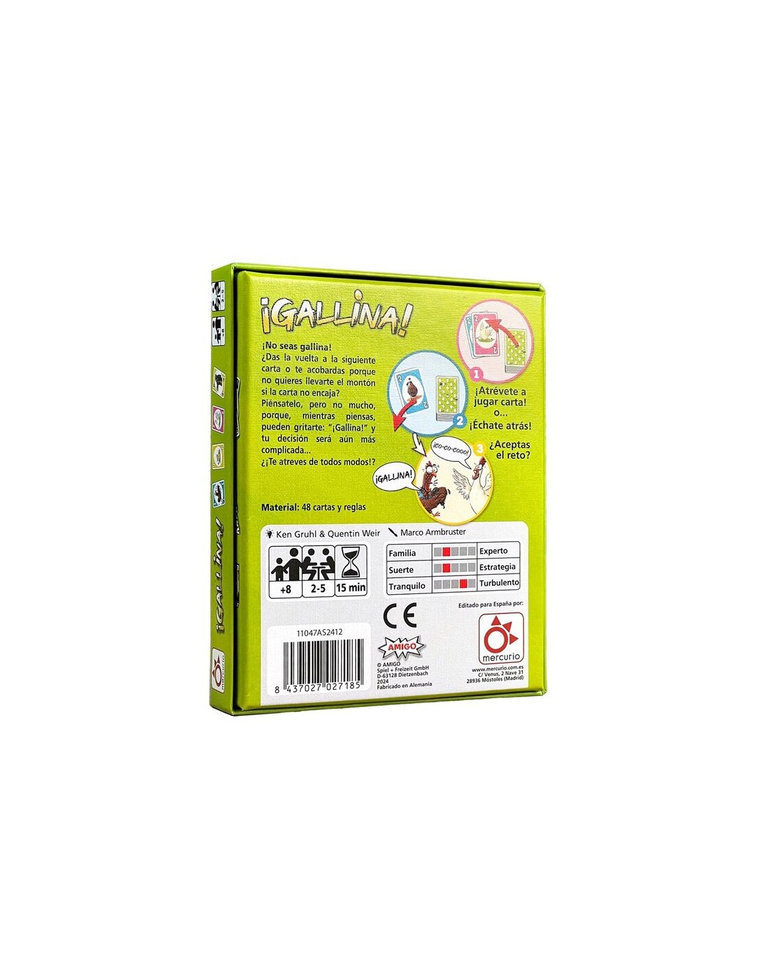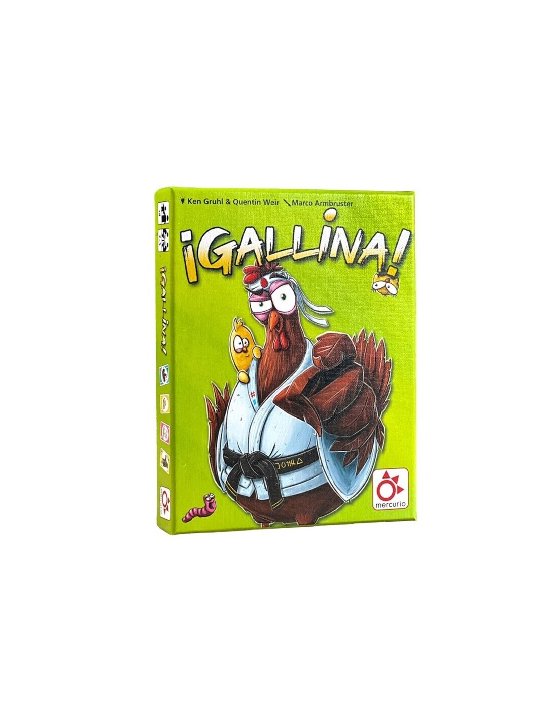 ¡Gallina! es un emocionante juego de cartas diseñado para toda la familia. Pon a prueba tu suerte y rapidez mental en este divertido juego en el que rápidamente hay que decidir si plantarte con una pequeña penalización o arriesgarte y si fallas recoger todo el montón de cartas que te penaliza. Todo ello antes de que te llamen ¡Gallina!