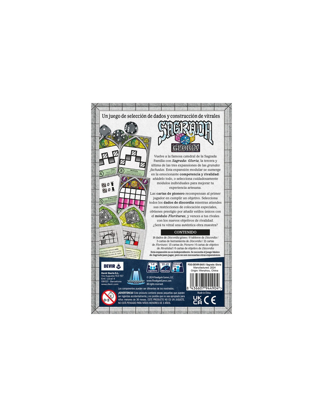"Sagrada Gloria" es la tercera y última expansión de "Grandes Fachadas" para el aclamado juego de mesa "Sagrada" de Devir. Diseñada por Adrian Adamescu y Daryl Andrews, esta expansión modular explora la emoción de la competición por crear las vidrieras más espectaculares de la Sagrada Familia.