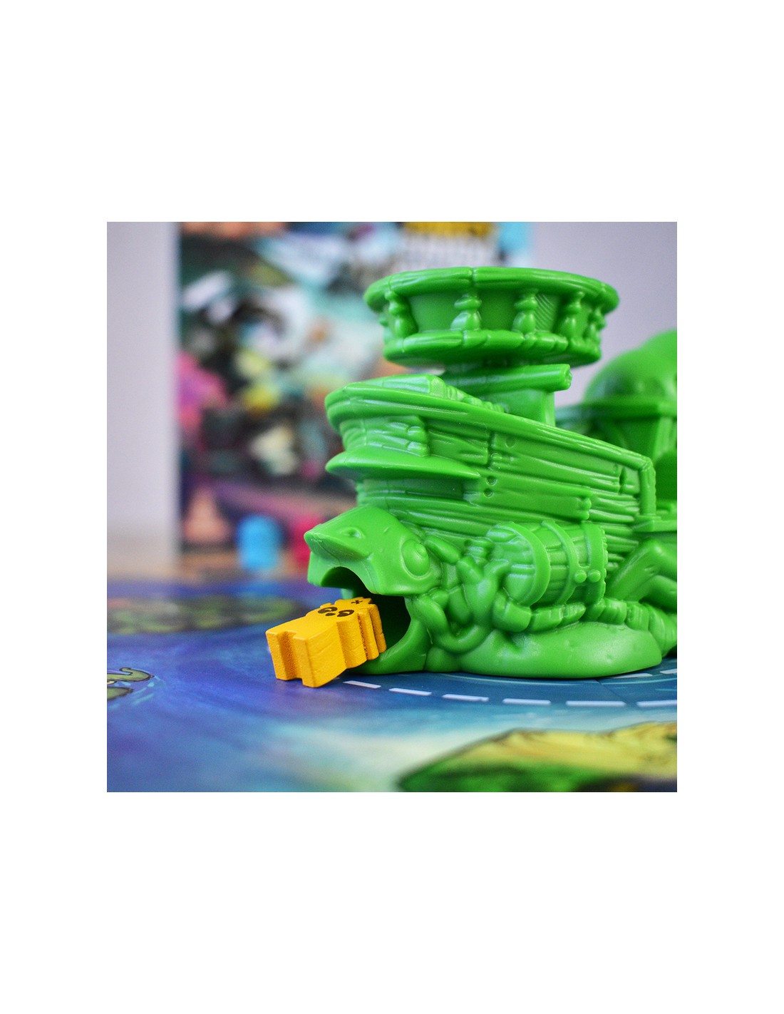 Fase de navegación: Desliza a tu panda pirata desde el barco tortuga en el centro del tablero marino y gana una moneda si aterrizas en el centro de una isla. Activa un minijuego desde la isla con más meeples.