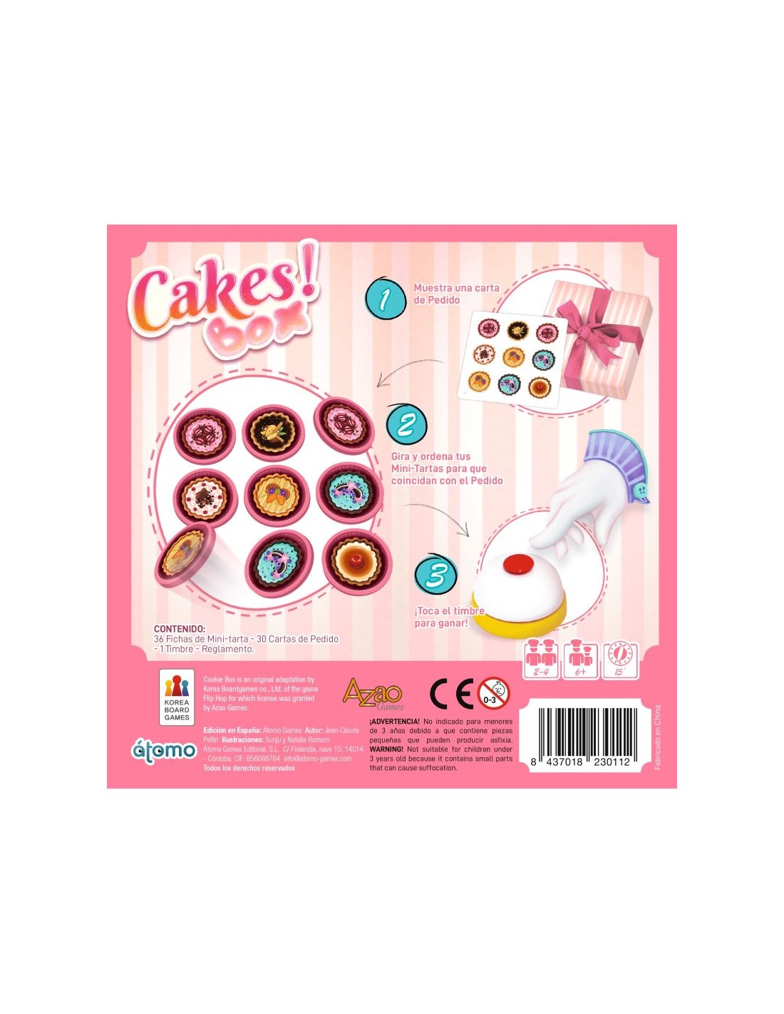 Cakes Box es un juego familiar a partir de 6 años y de 2 a 4 jugadores en el que tendremos demostrar que somos los más rápidos y mejores preparando pedidos de pastesles. Los jugadores tendremos que girar y ordenar nuestros pasteles para hacerlos coinciddir con la orden de pedido. El primero que acabe toca el timbre.