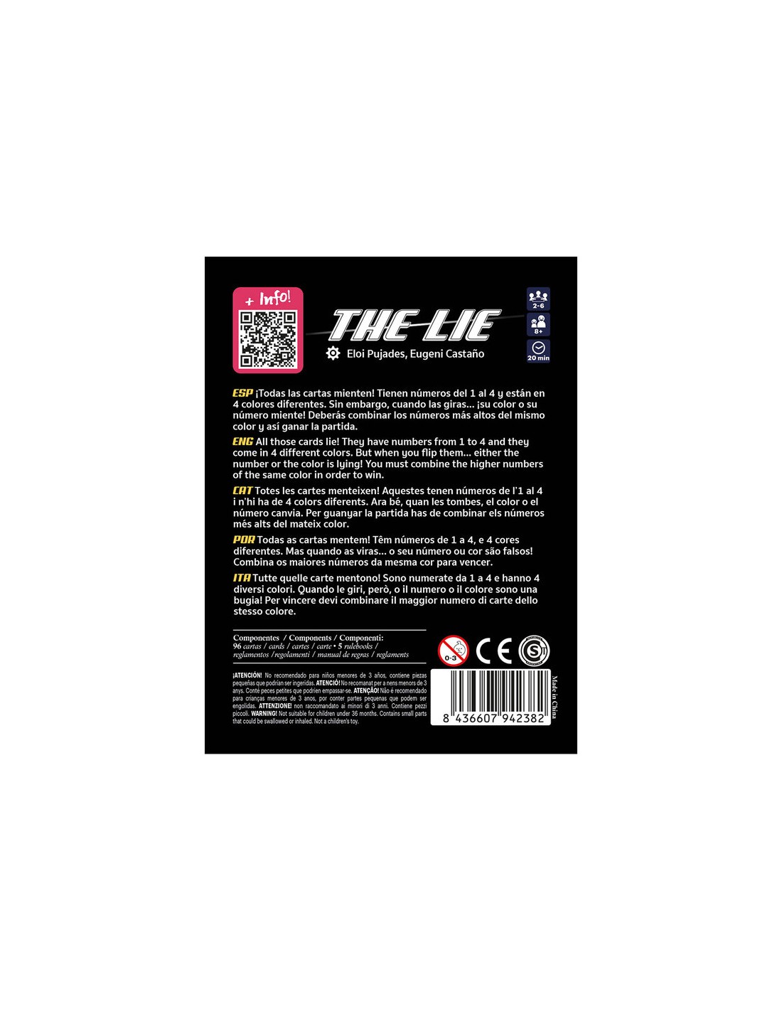 Con muy pocas reglas y muchísima rejugabilidad, The Lie es un juego ideal para cualquier clase de jugador o grupo de juego. Los más pequeños aprenderán a formar combinaciones numéricas, mientras que los mayores encontrarán un gran reto en la gestión de las cartas para quedarse rápidamente con la mano vacía. Y todo ello aderezado con un punto de azar, gracias al “reverso mentiroso” de las cartas. ¿Preparados para jugar con los números?