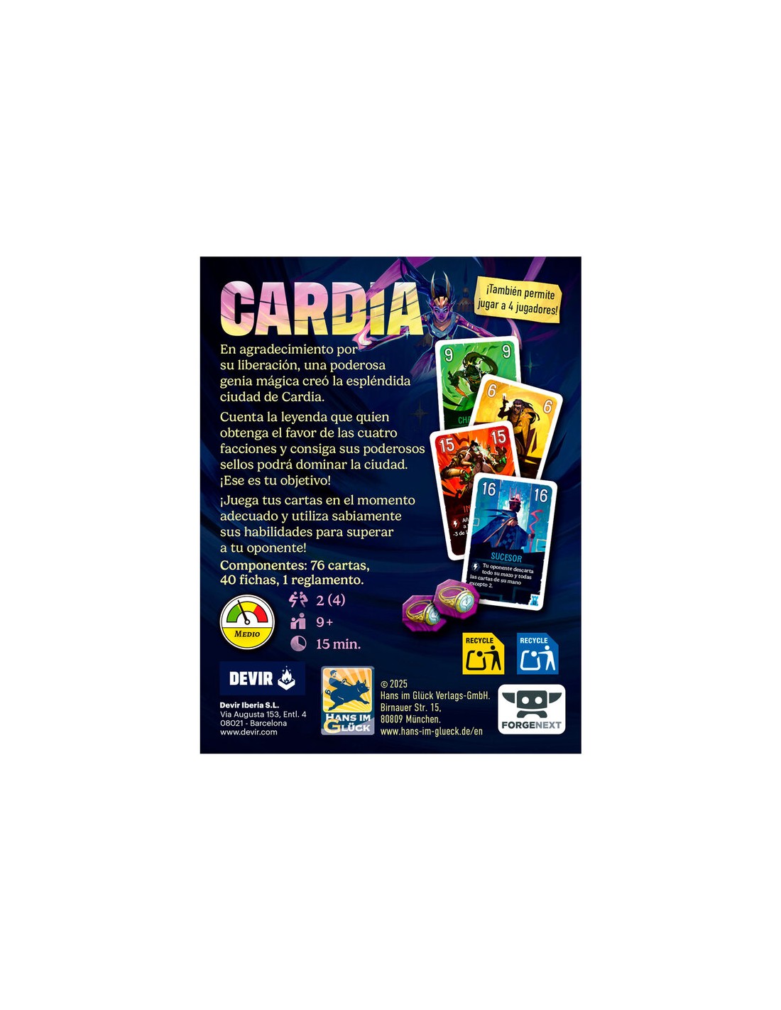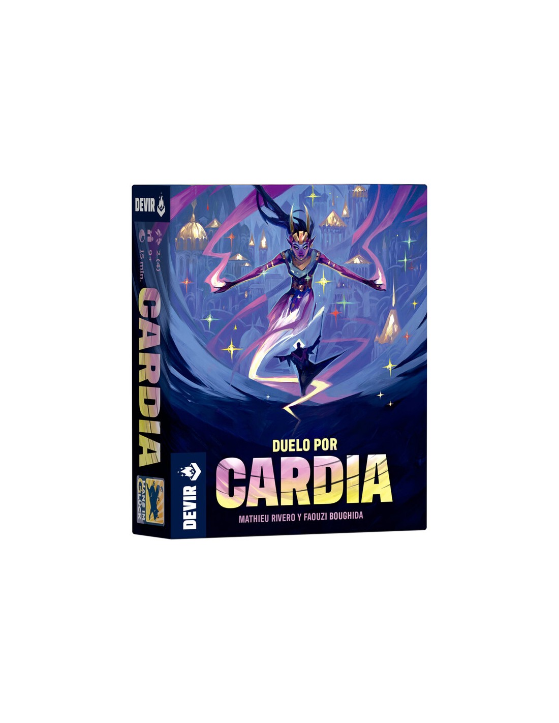 Duelo por Cardia es un juego de cartas vibrante y estratégico para 2 jugadores (con variante para 4), recomendado a partir de 9 años, con partidas rápidas de 15 minutos. Diseñado por Mathieu Rivero y Faouzi Boughida, este título te sumerge en la ciudad mágica de Cardia, donde cuatro facciones luchan por el poder: la Rebelión de los Pantanos, la Academia, el Gremio y la Dinastía.