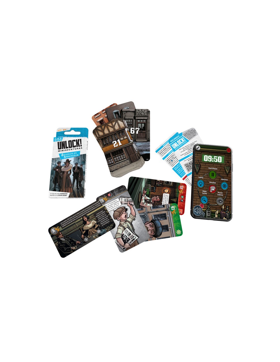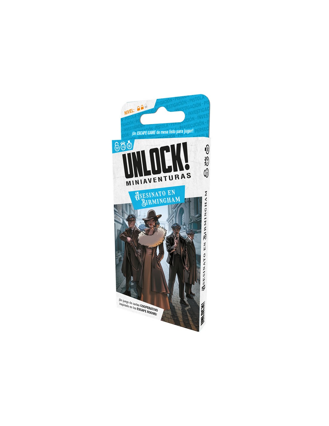 Unlock! Miniaventuras Asesinato en Birmingham es un juego de escape room que presenta una mini aventura cooperativa y de hasta 6 jugadores y una duración de unos 30 a 45 minutos. Contiene 30 cartas y se juega con una aplicación.