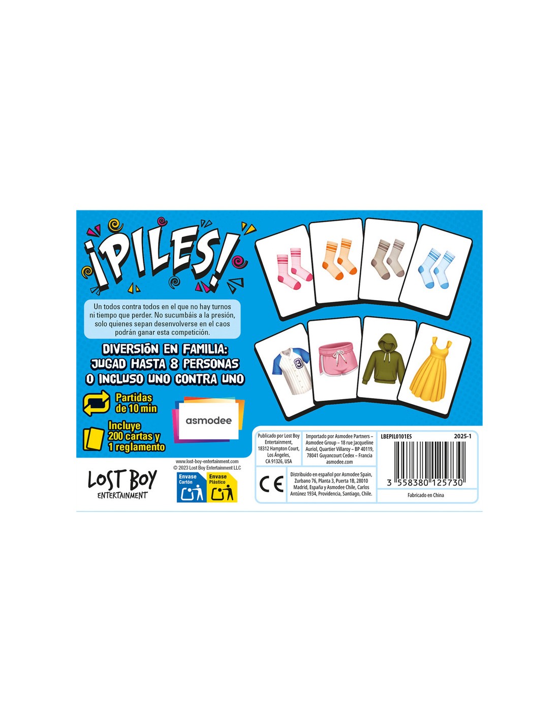 En ¡PILES!, todos los jugadores compiten al mismo tiempo, sin turnos ni pausas. El objetivo es emparejar conjuntos de ropa intercambiando cartas a través de una pila de descarte común. La mecánica se basa en la observación, memoria y reflejos, lo que lo hace ideal para quienes disfrutan de los juegos de rapidez.