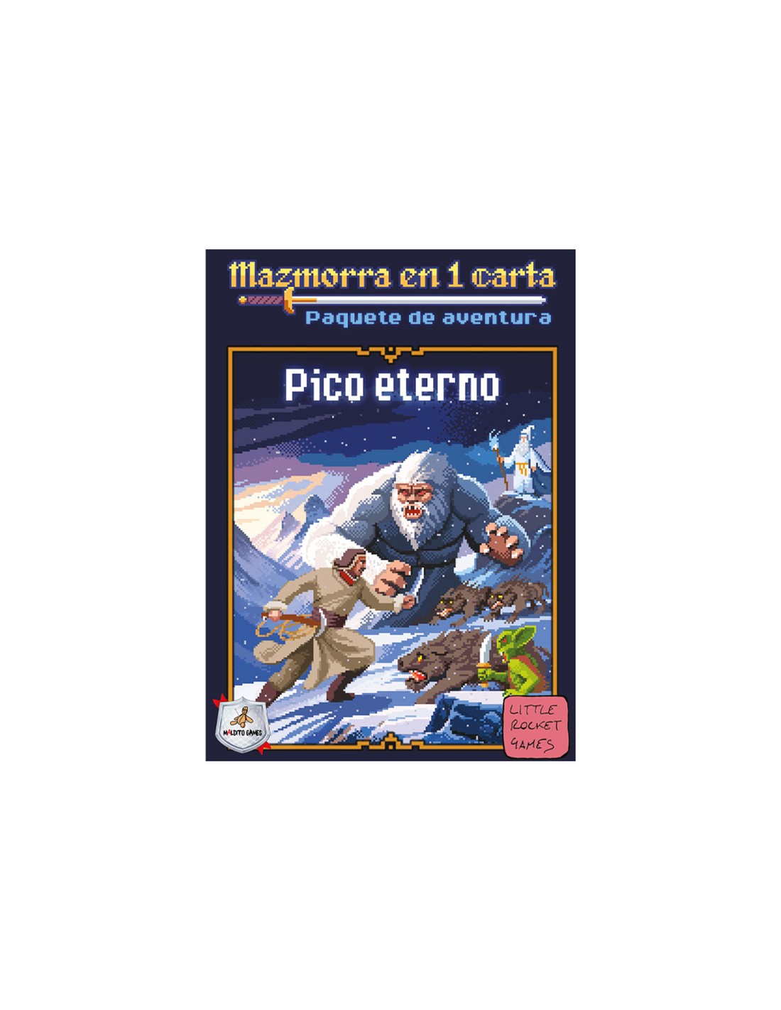 Mazmorra en 1 Carta: Pico Eterno es una aventura independiente compatible con el aclamado juego de dados en solitario Mazmorra en 1 Carta. Esta expansión te transporta a las cumbres heladas para enfrentarte al temible hechicero blanco y su ancestral tormenta mágica. Su poder gélido corrompe la tierra, sumergiendo el mundo en una desesperación helada. Solo los héroes más audaces podrán atravesar el temporal y devolver la luz.