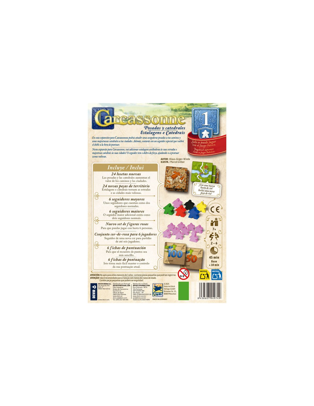 Carcassonne: Posadas y Catedrales es la primera gran expansión del aclamado juego de mesa de colocación de losetas, Carcassonne, y es considerada por muchos aficionados como una ampliación fundamental. Introduce nuevos elementos estratégicos y más diversión, haciendo tus partidas más complejas e interesantes. Incluye las piezas necesarias para aumentar el número de jugadores hasta un máximo de 6 que servirán tanto para el juego base como para las distintas expansiones.
