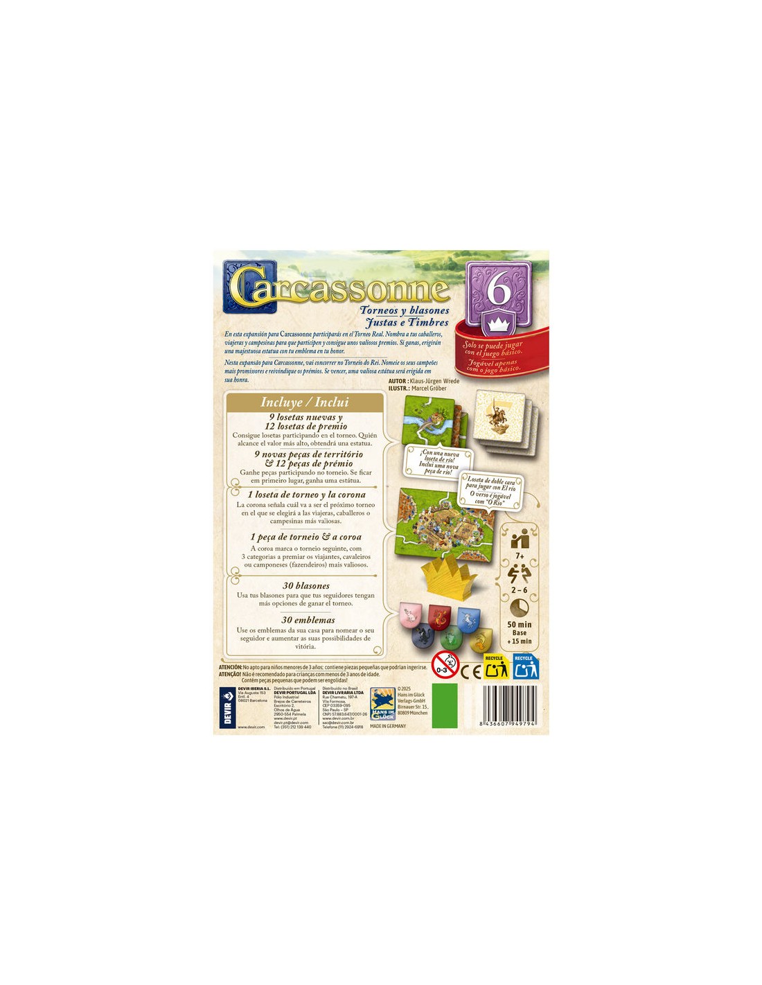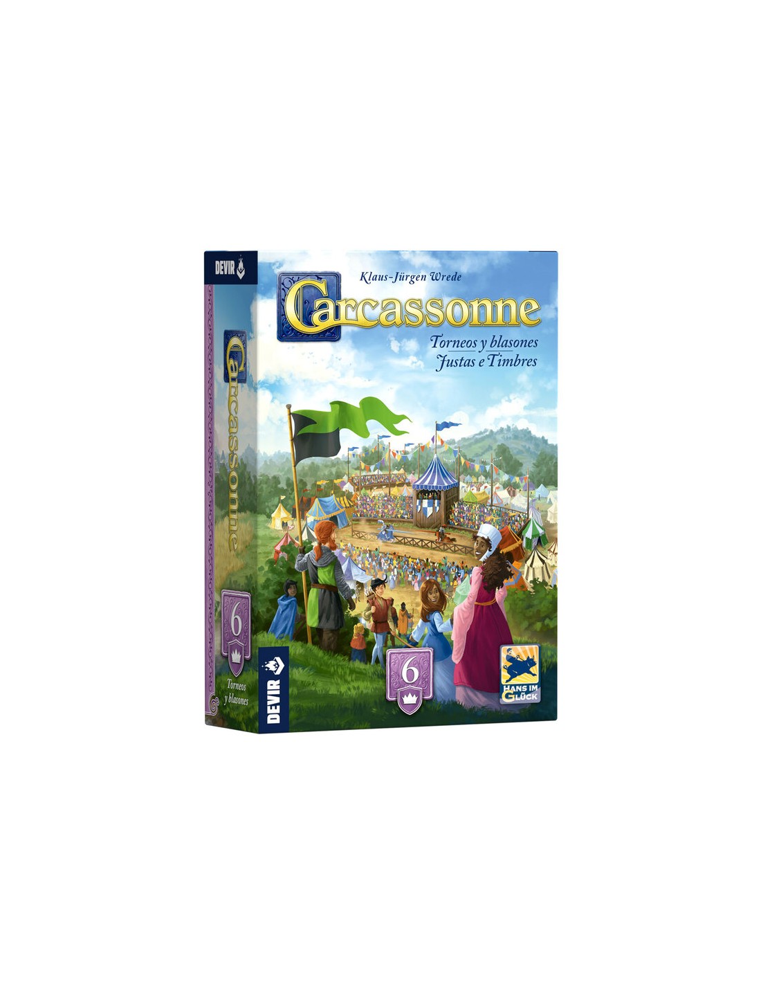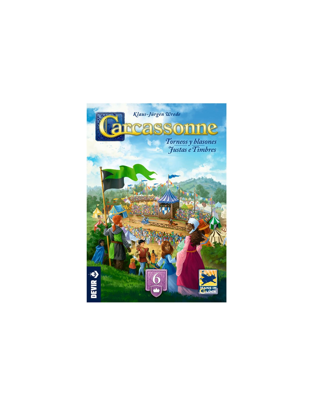 Carcassonne: Torneos y Blasones es la Expansión 6 del clásico juego de losetas, que introduce la mecánica de los torneos reales y los blasones para añadir una capa de competencia y recompensa. Los jugadores envían a sus caballeros, campesinas y viajeras a participar en torneos marcados en el tablero. Si ganan, obtienen losetas de premio y pueden erigir una estatua con su emblema, ganando prestigio y puntos adicionales.