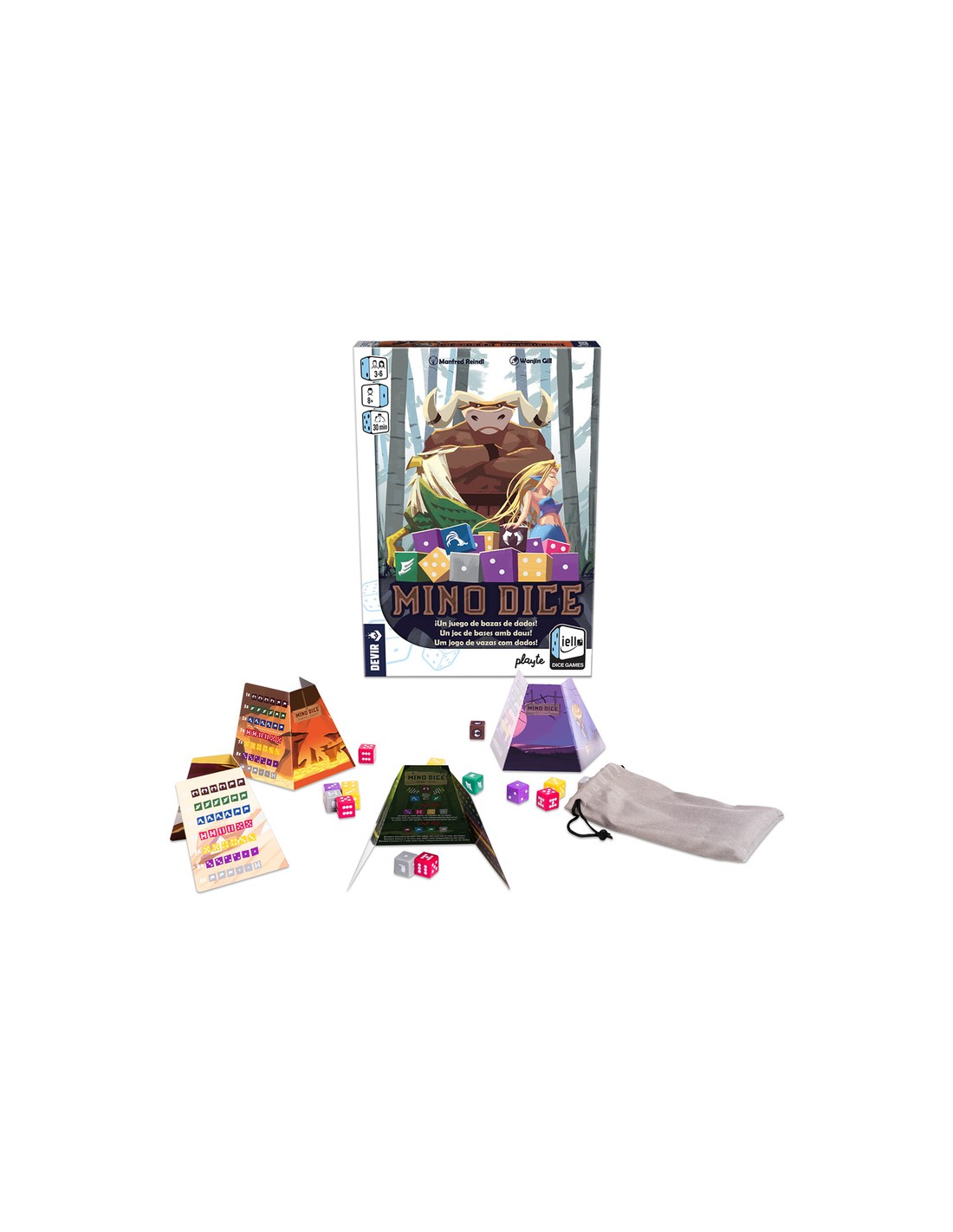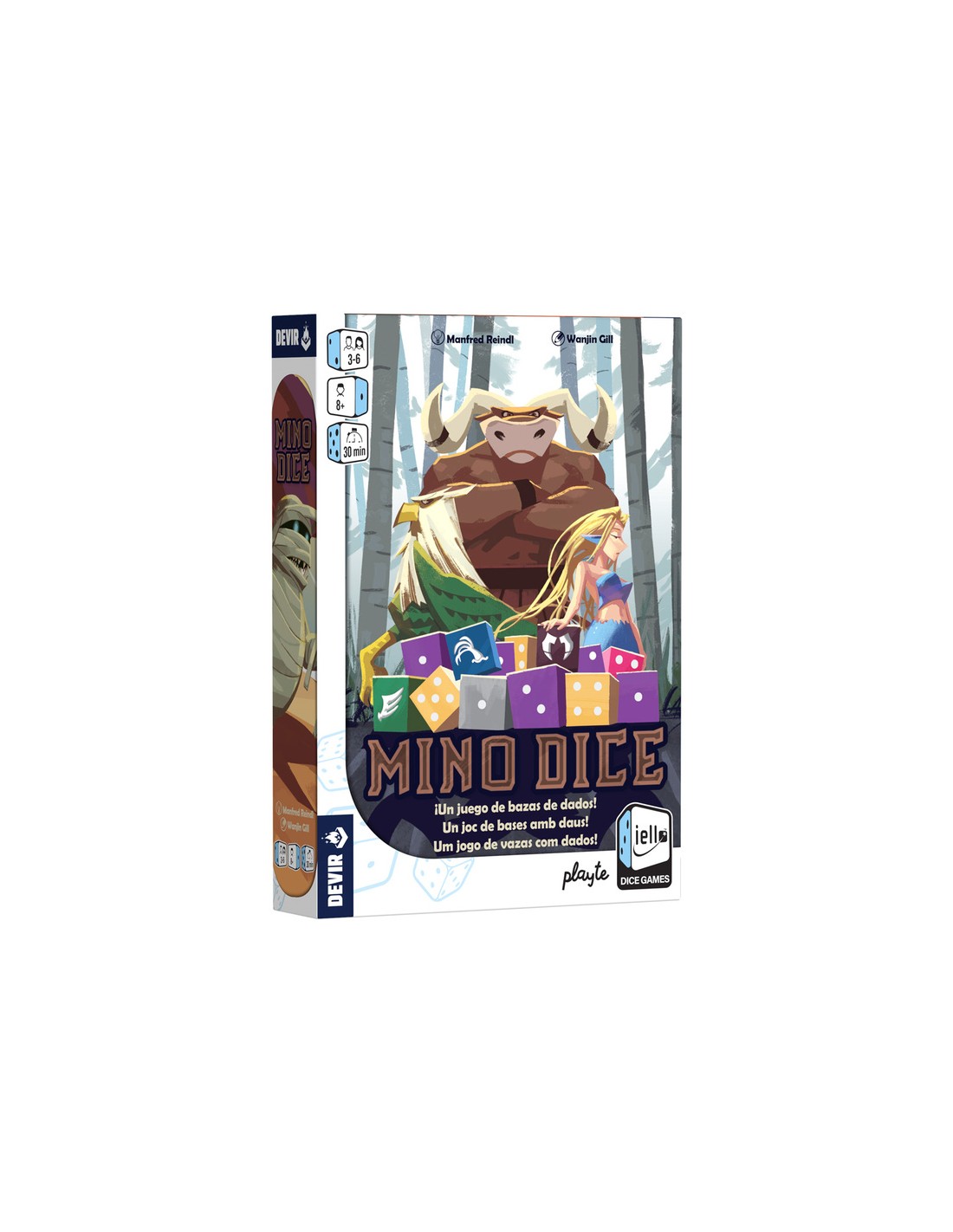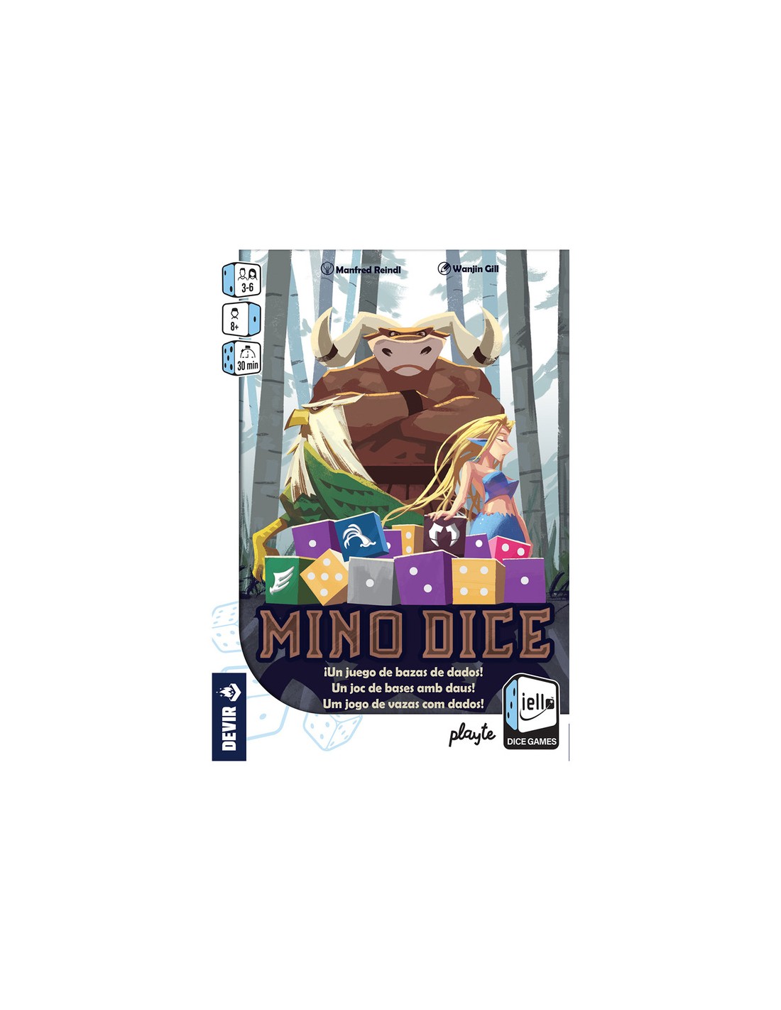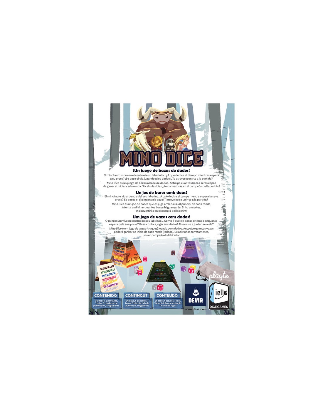 El minotauro vive en el centro de su laberinto… ¿A qué dedica el tiempo mientras espera a su presa? ¡Se pasa el día jugando a los dados! ¿Te atreves a unirte a la partida? Mino Dice es un juego de bazas a base de dados. Anticipa cuantas bazas serás capaz de ganar al iniciar la ronda. Si calculas bien, ¡te convertirás en el campeón del laberinto!