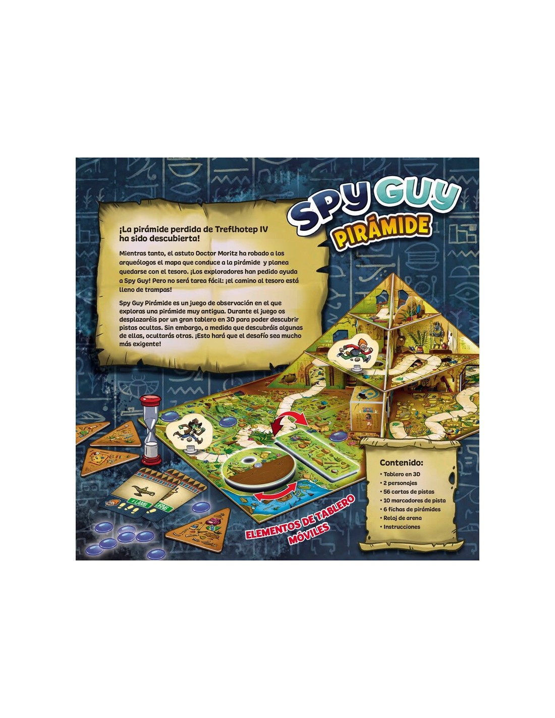Spy Guy Pirámide es un emocionante juego de mesa de observación, deducción y aventura en 3D ideal para niños (a partir de 6 años) y toda la familia.
