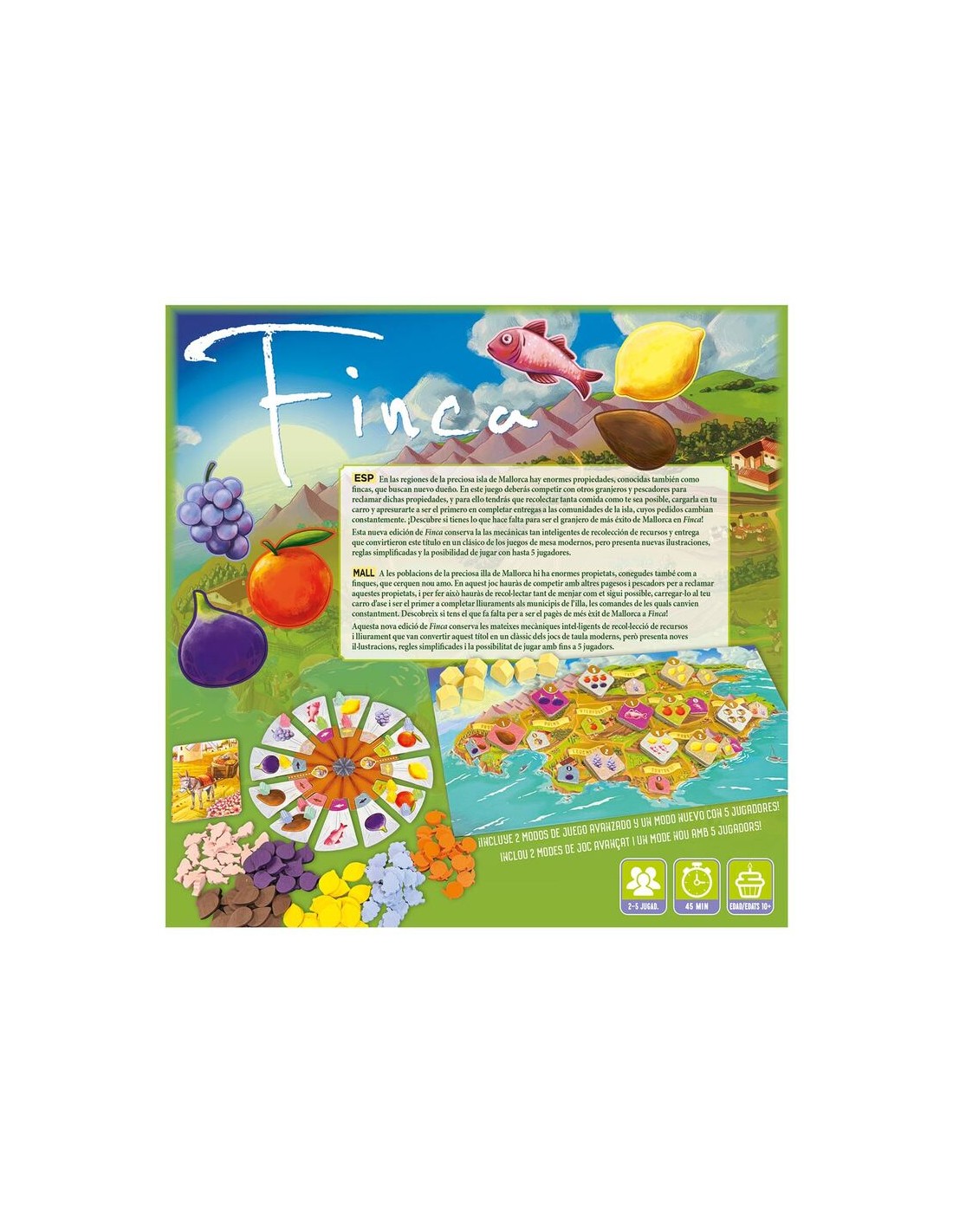 Diseñado por Wolfgang Sentker y Ralf zur Linde, firman el nuevo apartado gráfico Vincent Dutrait y Joan Guardiet. Permite partidas para grupos de 2 a 5 jugadores, a partir de 10 años, de unos 45 minutos de duración. Para ganar en Finca, debemos conseguir el máximo número de puntos de victoria posibles reuniendo recursos mallorquines y repartiéndolos entre distintos municipios de la isla.