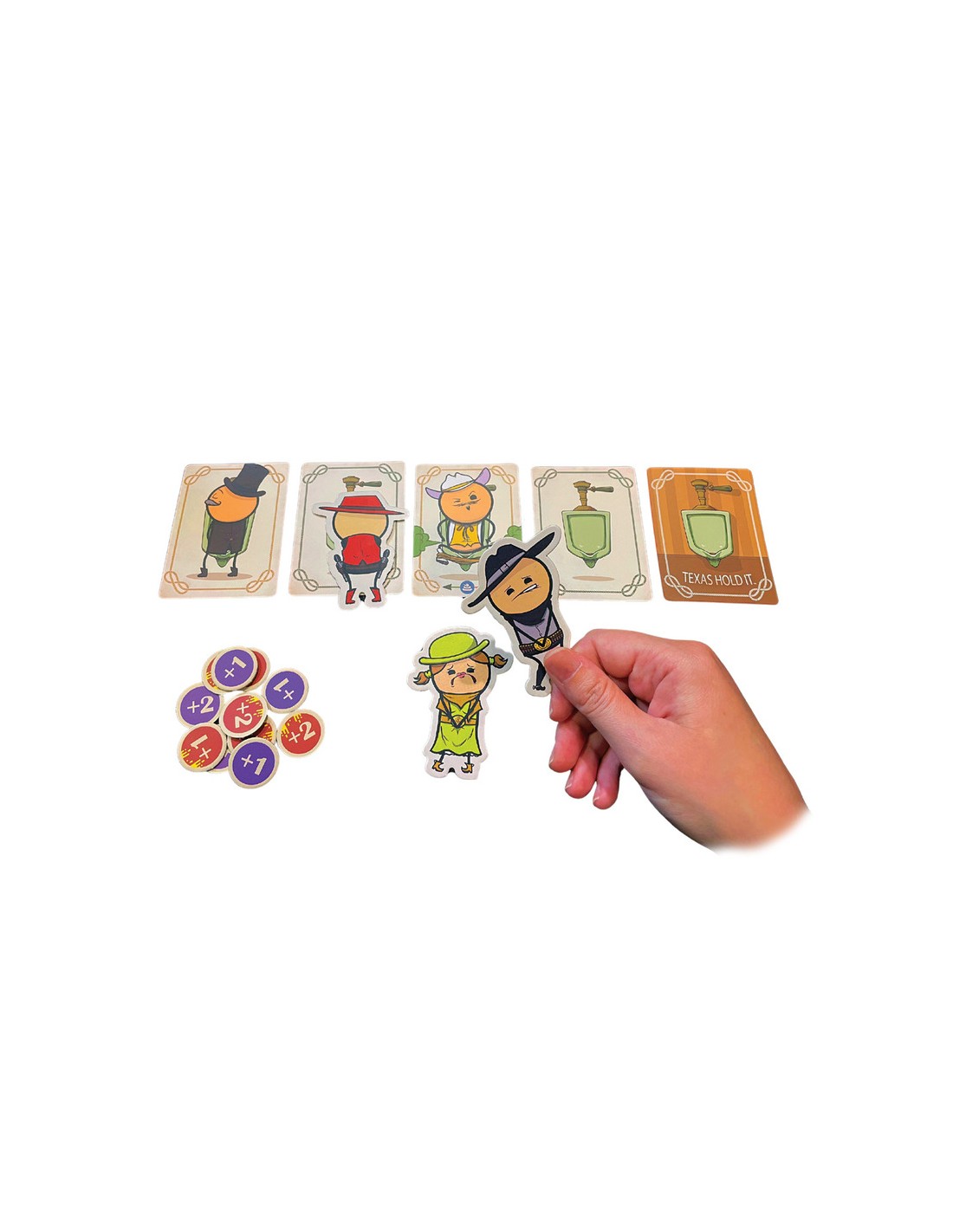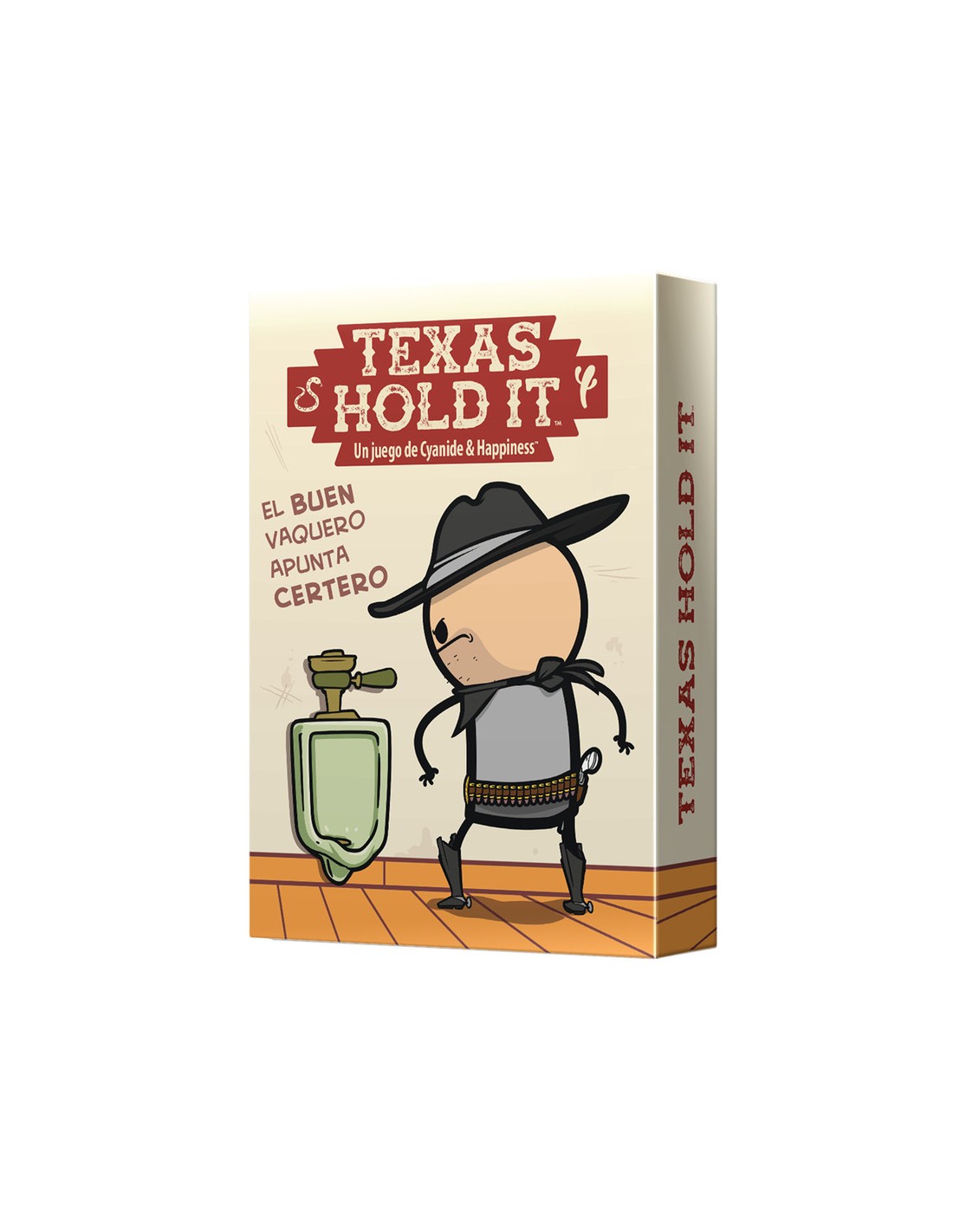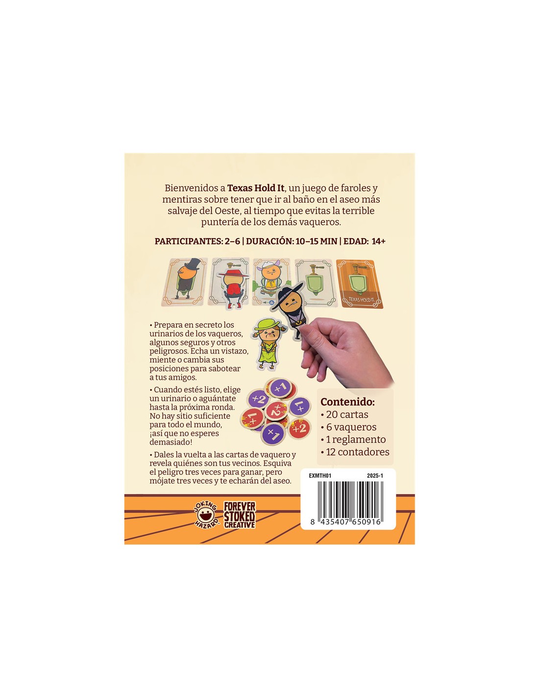 Texas Hold It, es un divertido y rápido juego de cartas de faroles y mentiras con una temática de humor ambientada en el Lejano Oeste. Olvídate del póker; aquí la meta es conseguir ir al baño en el aseo más salvaje, ¡evitando la terrible puntería de los demás vaqueros!