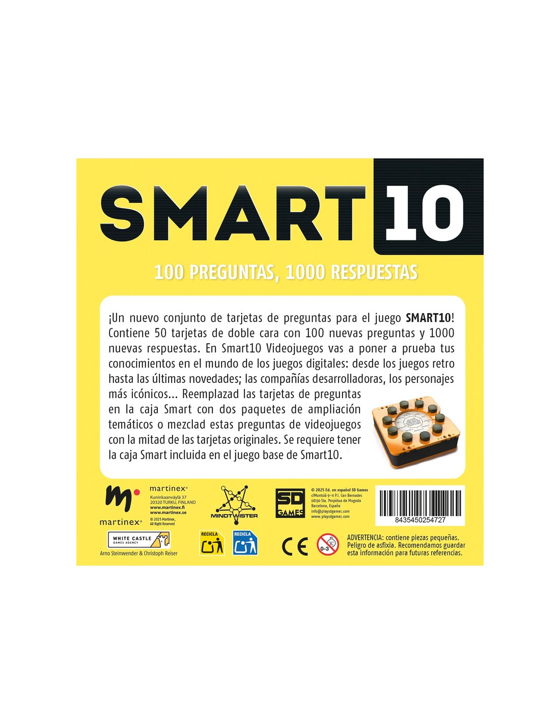 Smart 10 Videojuegos se centra exclusivamente en el universo digital, con 50 tarjetas a doble cara (100 preguntas) y 1000 respuestas nuevas que cubren un amplio espectro: