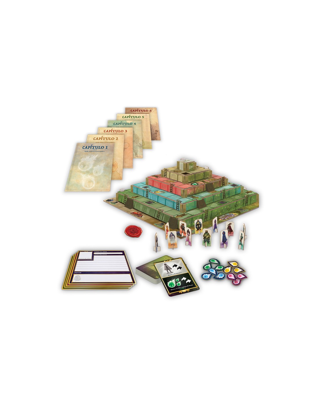 El objetivo cambia en cada capítulo. En la primera partida, los héroes deben escalar hasta la cima del zigurat y llegar a salvo, evitando los pozos y escapando de los temibles espíritus de fuego. Estos espíritus, que se desplazan por escaleras y toboganes, representan una amenaza constante: si alcanzan a un héroe o llegan a la cima, ¡todos los jugadores pierden la partida! Para ganar, será necesario cooperar, planificar con antelación y coordinar cuidadosamente cada movimiento.